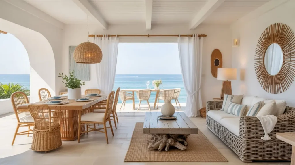 Add warmth through layered whites and creams rather than stark white. Bring in woven baskets, ceramic vases in ocean-inspired glazes, and light wood tones. The key? Everything should feel relaxed and effortless, like you just naturally live this beautifully. Spoiler alert: nobody actually lives this beautifully without effort, but we can pretend 🙂