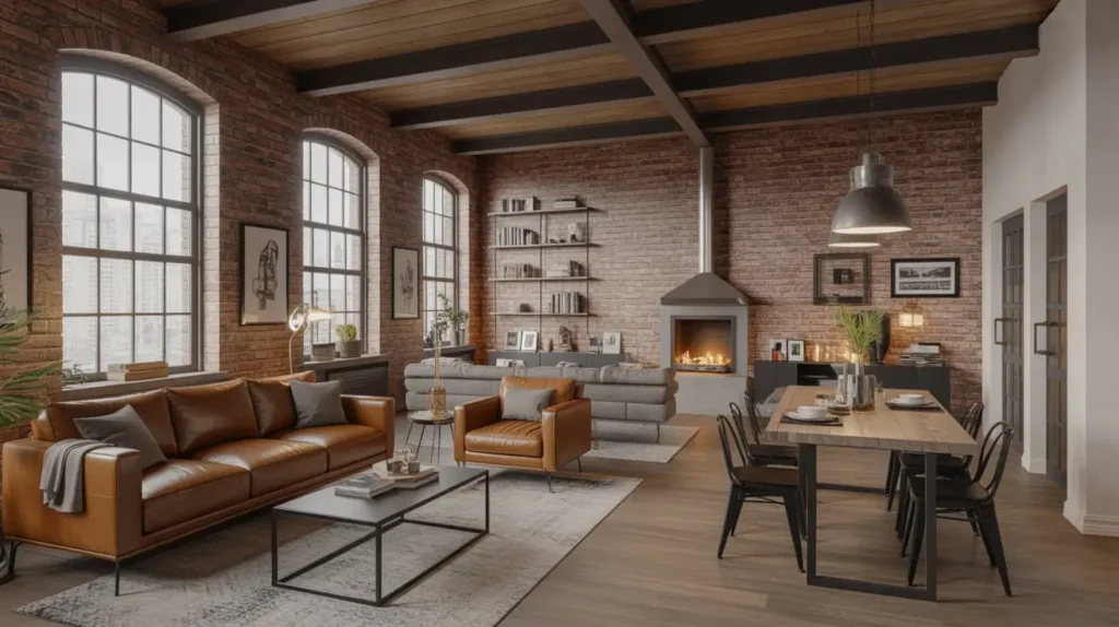 Industrial design might sound cold—all that exposed brick, metal, and concrete—but it creates surprisingly cozy combo spaces when you balance the hard edges with soft elements. You’re working with architectural honesty and raw materials that tell a story.
