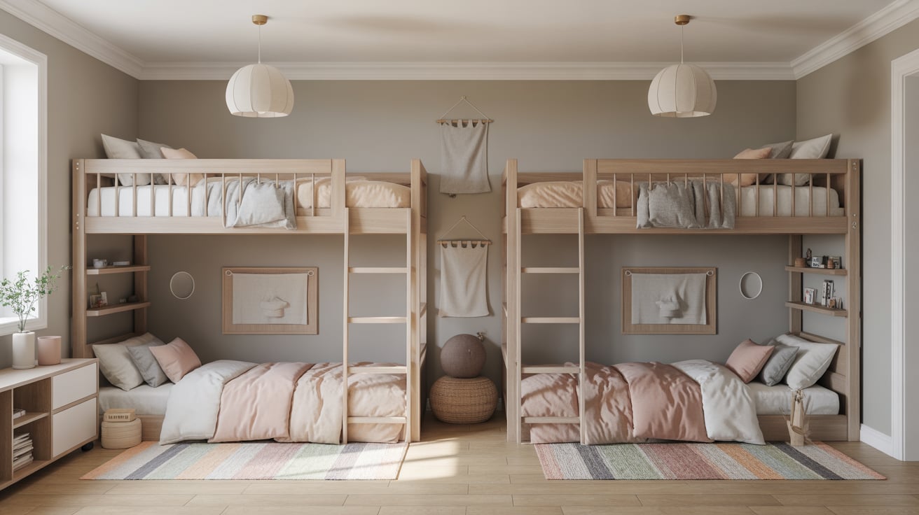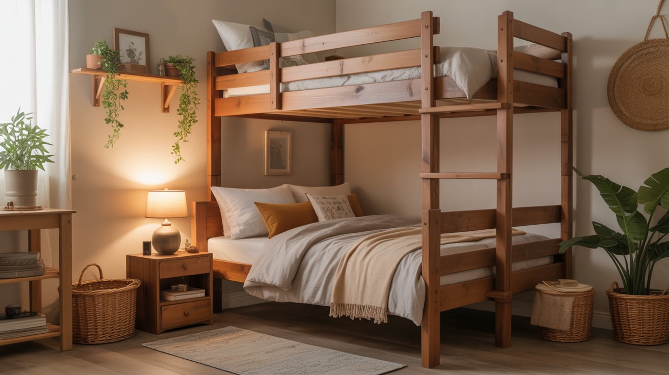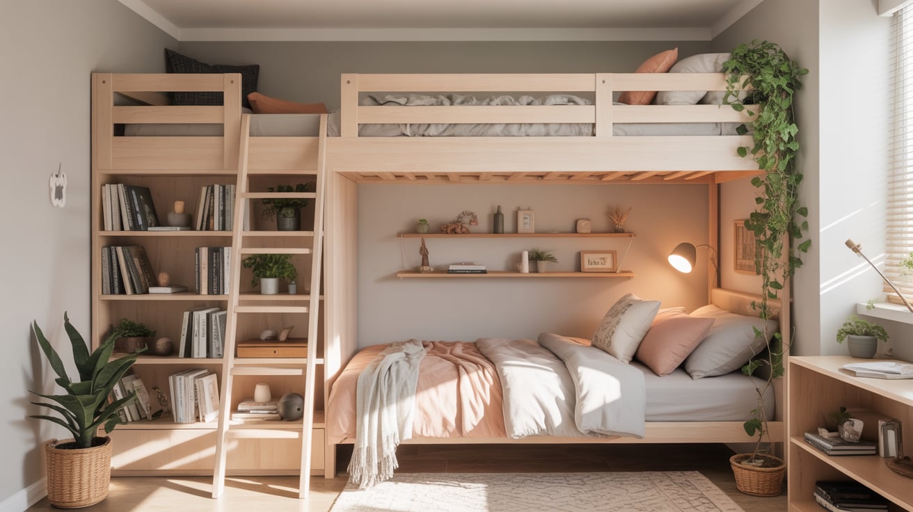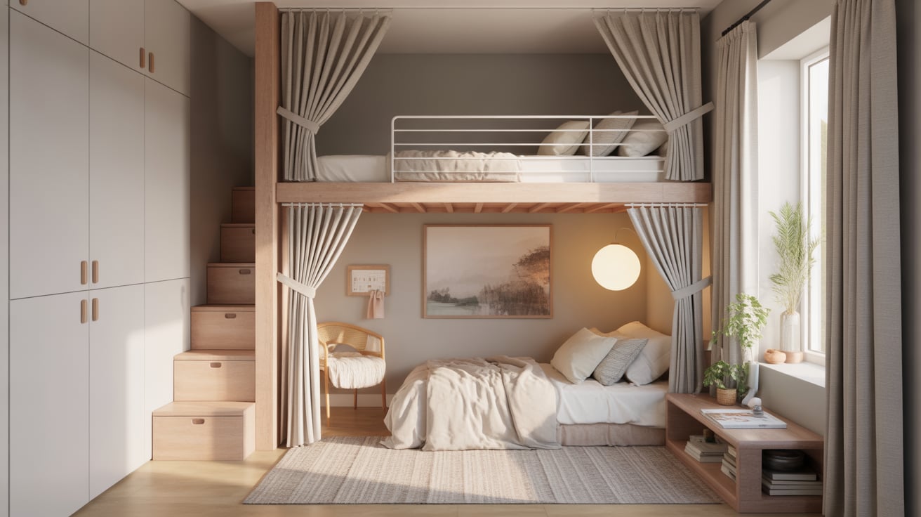 In my friend’s tiny apartment, we stacked two loft beds creatively to accommodate roommates. The multi-level setup freed floor space for seating and storage while making the room feel playful and functional.