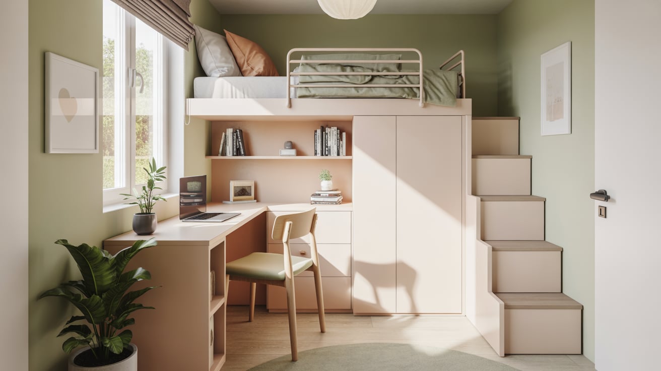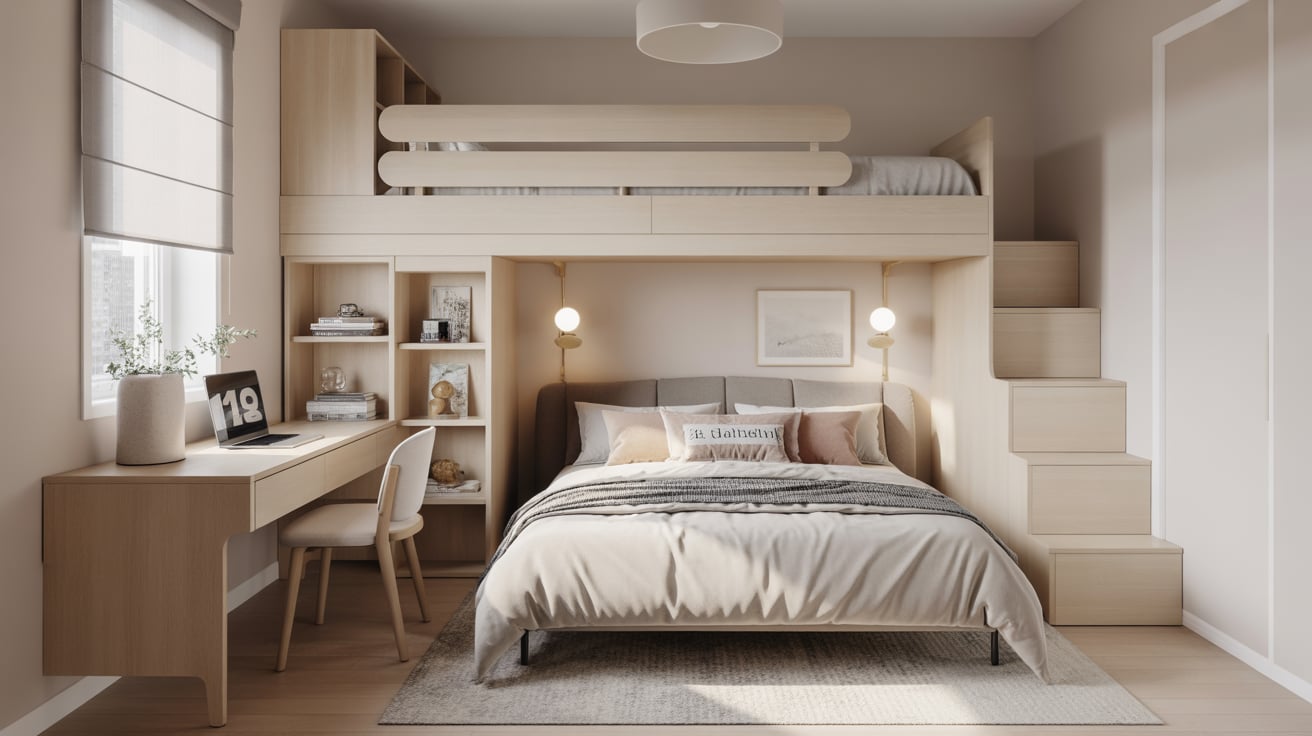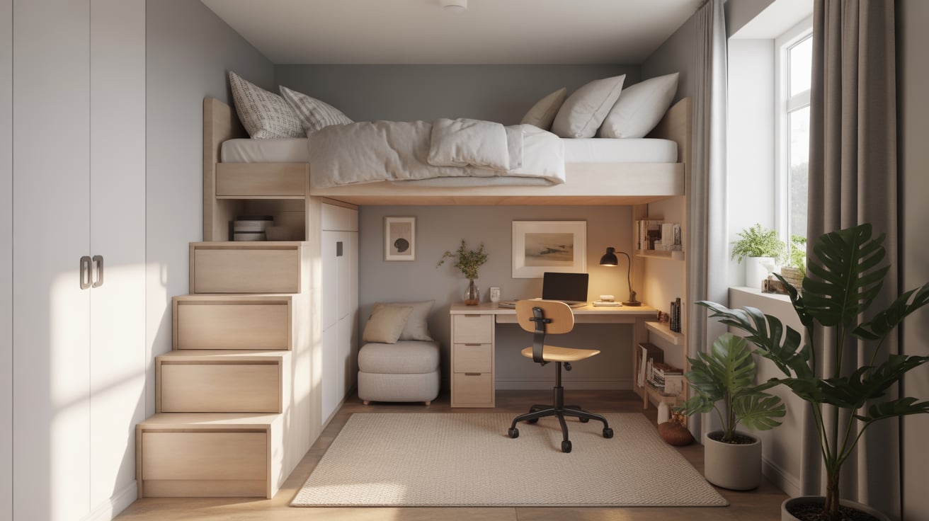 In my first tiny bedroom, piles of clothes were always taking over the floor. Switching to a loft bed with built-in drawers underneath kept everything neatly tucked away. It made cleaning so much easier and freed up floor space.