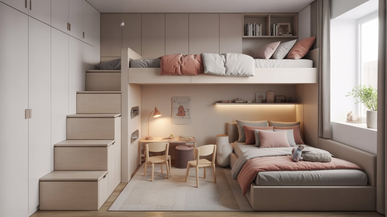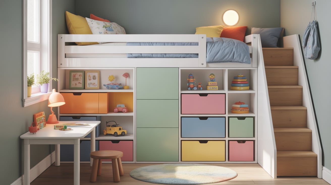 This works because it turns a small room into a multi-functional zone. Kids can sleep, play, and store their toys without cluttering the room.