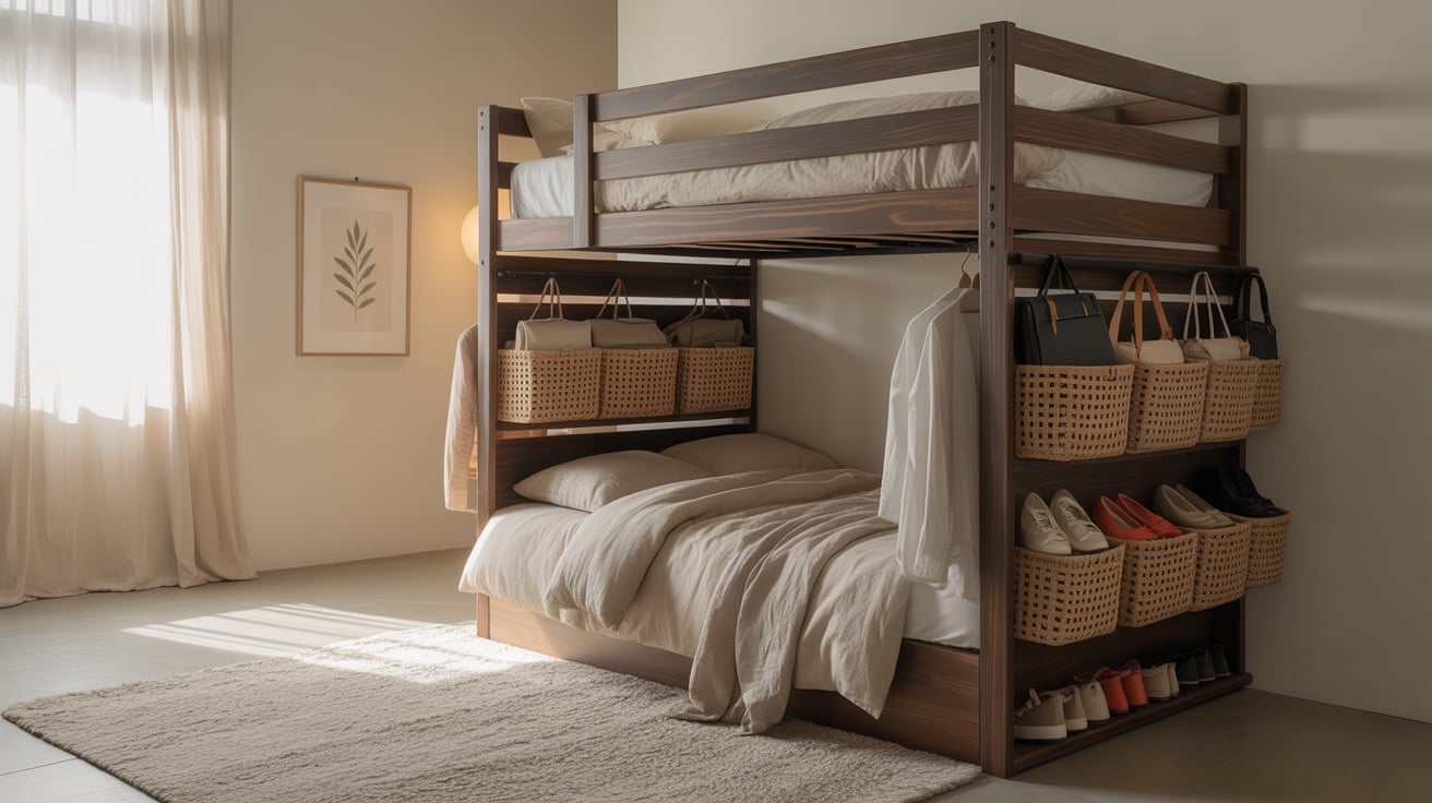 I used to have a tiny closet and a pile of shoes taking over the floor. Installing hanging organizers from my loft bed frame created extra storage without losing space. Shoes, bags, and clothes all found a home.