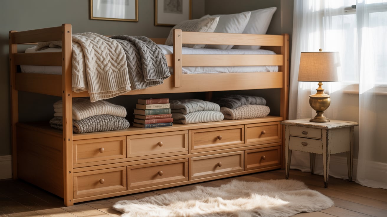 Storage drawers work because they turn unused under-bed space into functional storage. This setup is ideal for clothes, bedding, books, or toys, keeping your room clutter-free while maximizing space.