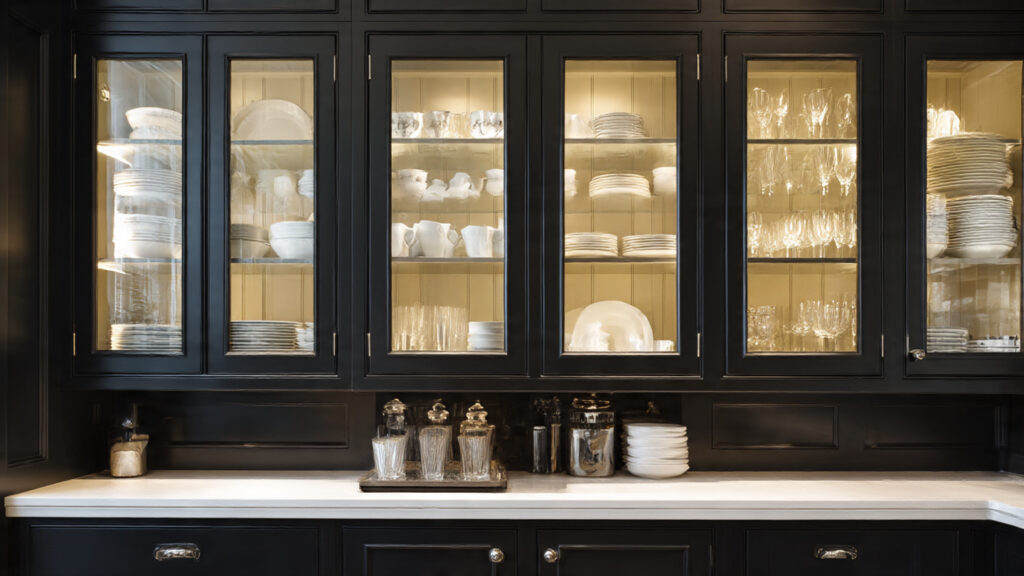 When I helped my sister redesign her kitchen, we replaced her solid upper cabinets with glass-front black frames — and instantly, the space felt open yet dramatic.