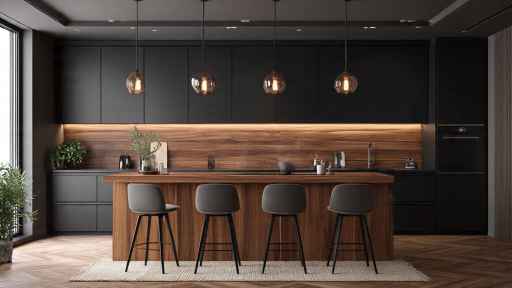 Black and wood together create natural warmth and visual depth. The mix of textures prevents the kitchen from feeling cold or stark.