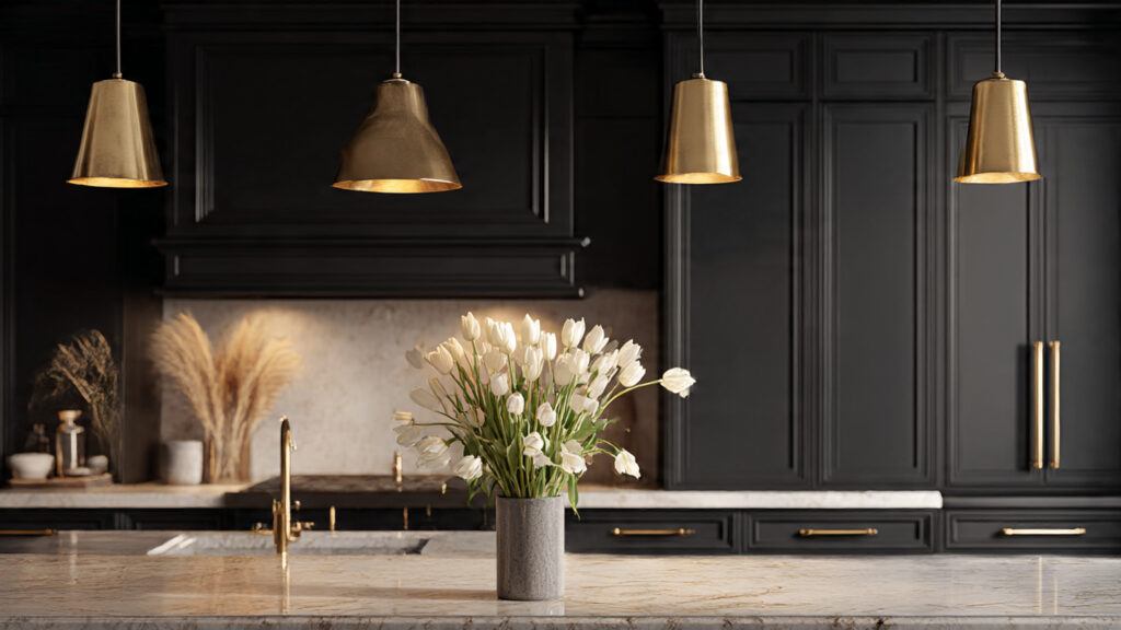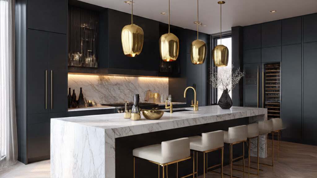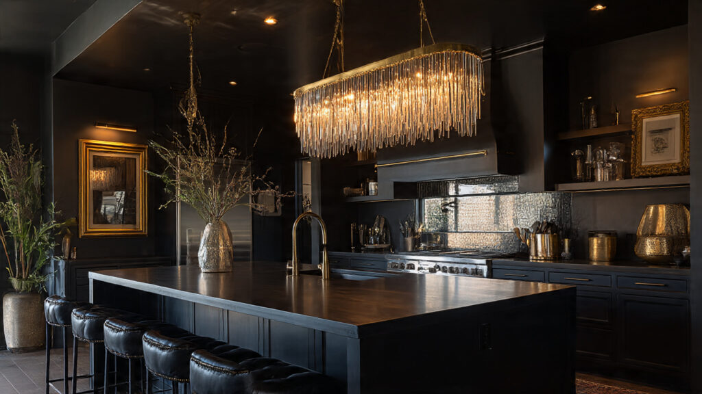 Lighting can make or break a black kitchen. The right fixtures highlight depth, create warmth, and define luxury.