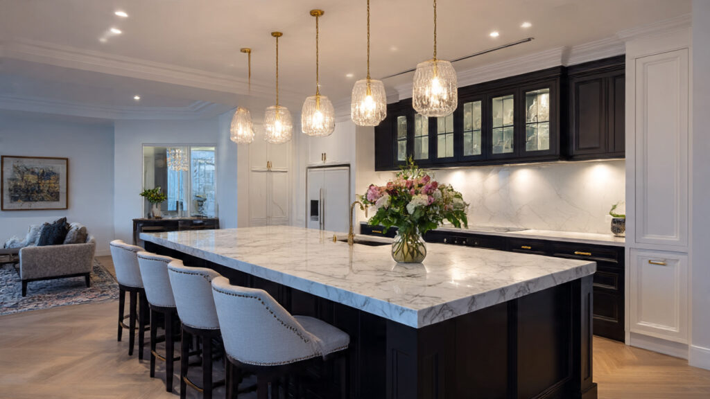 A black island draws the eye, creating a strong focal point. It’s a luxurious touch that blends function with artistry.