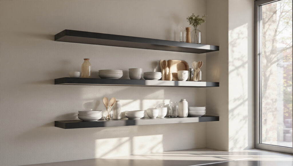 Open shelving in black or with black brackets brings lightness while maintaining a high-end aesthetic. It gives space for décor and personal touches without overwhelming the room.
