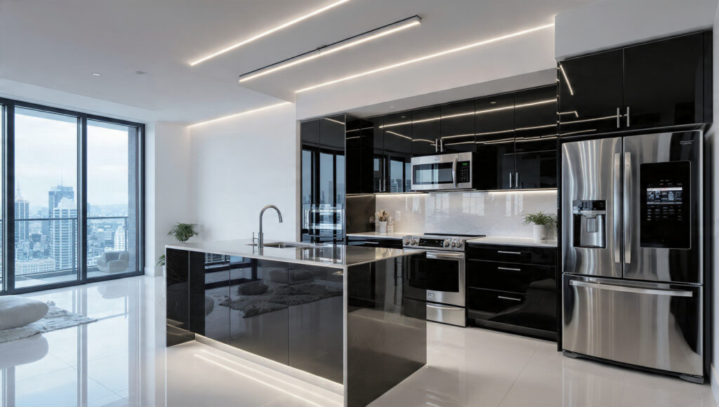 When I toured a modern penthouse last year, the high-gloss black cabinets reflected every light beautifully. It felt clean, polished, and ultra-modern — like a luxury showroom.