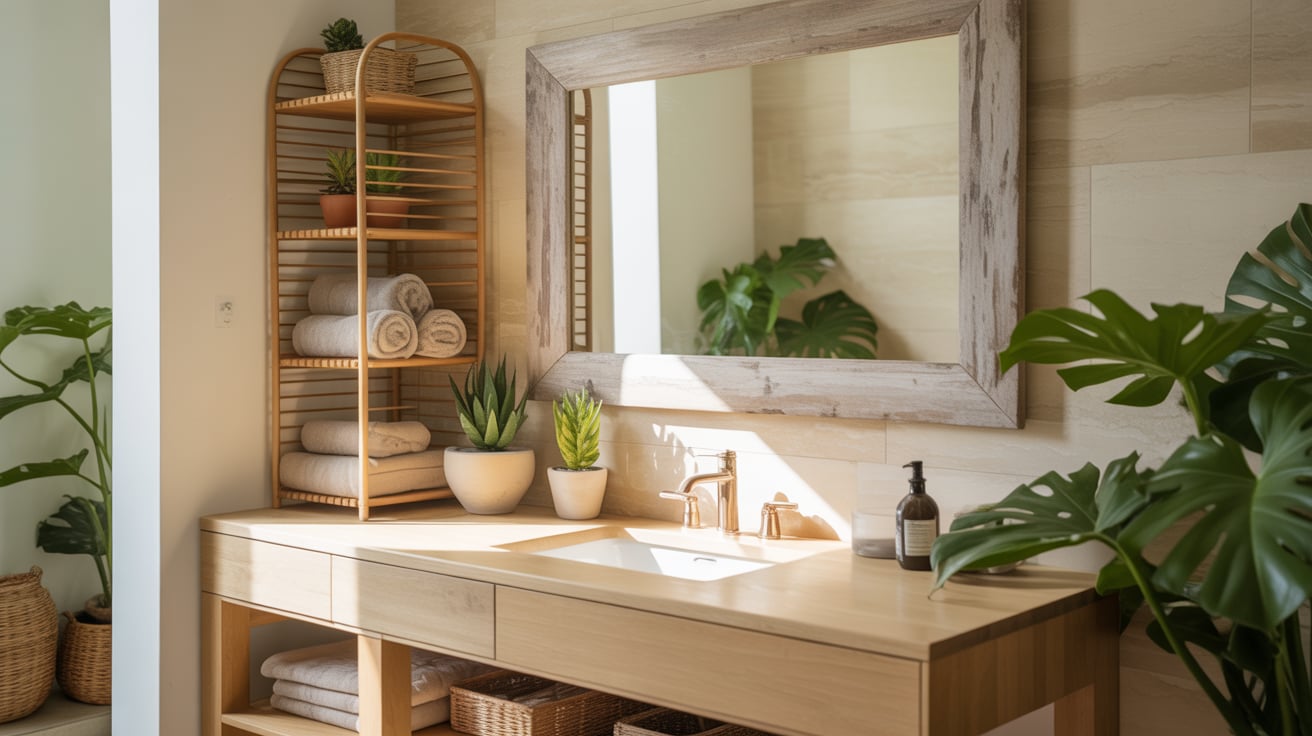 Growing up, my mom always loved wooden furniture — so I brought that warmth into my modern bathroom. A light oak vanity, bamboo shelf, and woven basket instantly made it feel cozy yet contemporary.