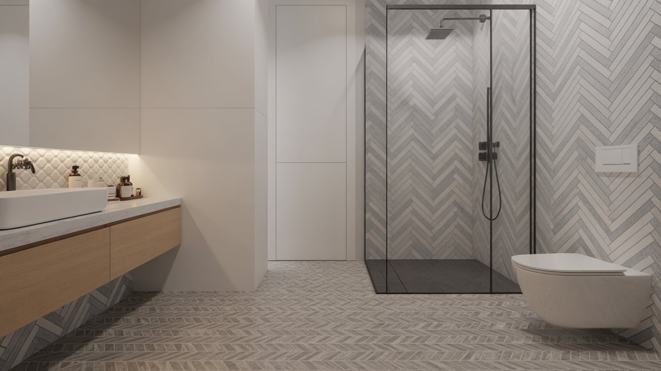 Geometric patterns give a modern edge while maintaining visual flow. They add depth, movement, and style to small bathrooms.