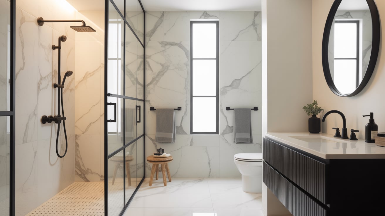 This design idea works because contrast adds depth. A neutral backdrop (white, beige, or gray) with black fixtures brings out that modern, high-end hotel vibe without overwhelming the space.