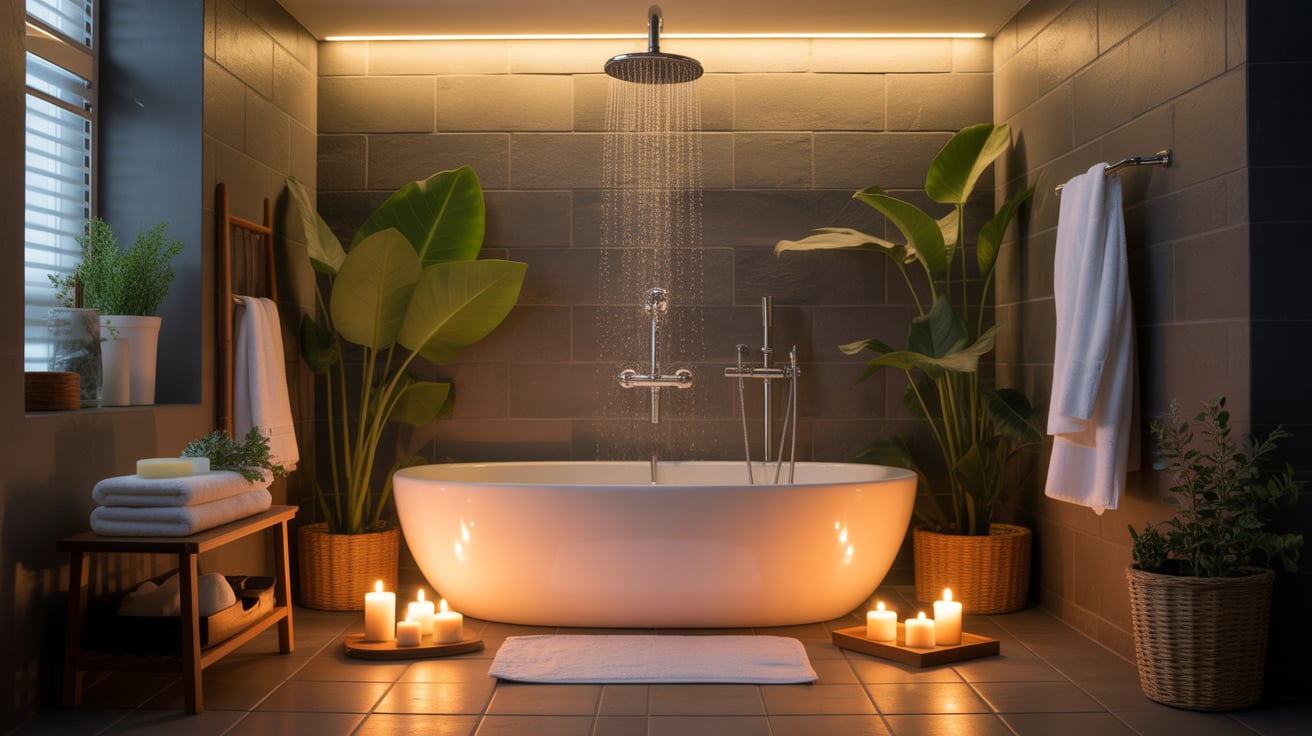 Once I realized my harsh overhead bulb was killing the mood, I swapped it for layered lighting — sconces by the mirror, LED strips near the floor, and a dimmer switch. Now it feels like a spa.