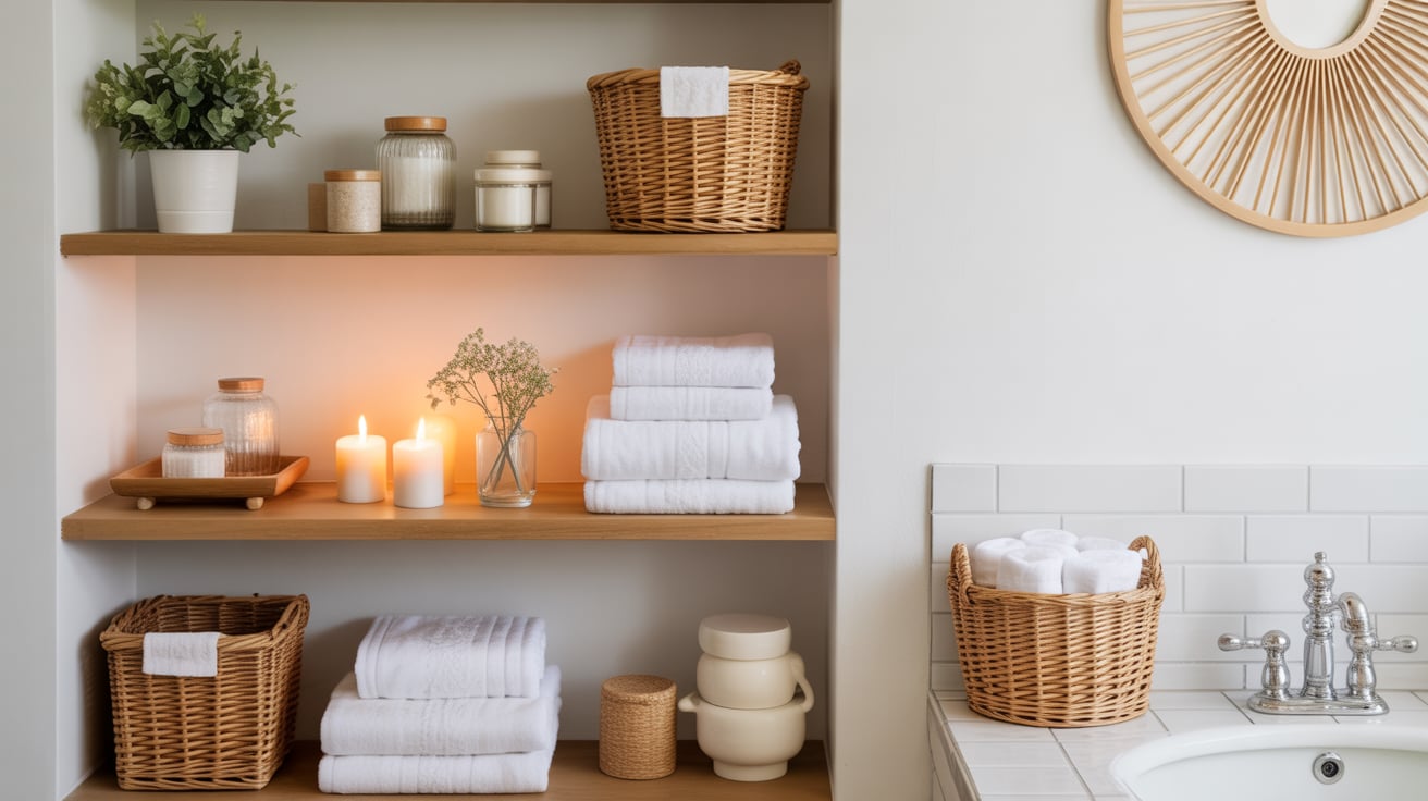 In my old bathroom, closed cabinets made the space feel boxed in. Switching to open wood shelves changed everything — now it looks airy and curated.