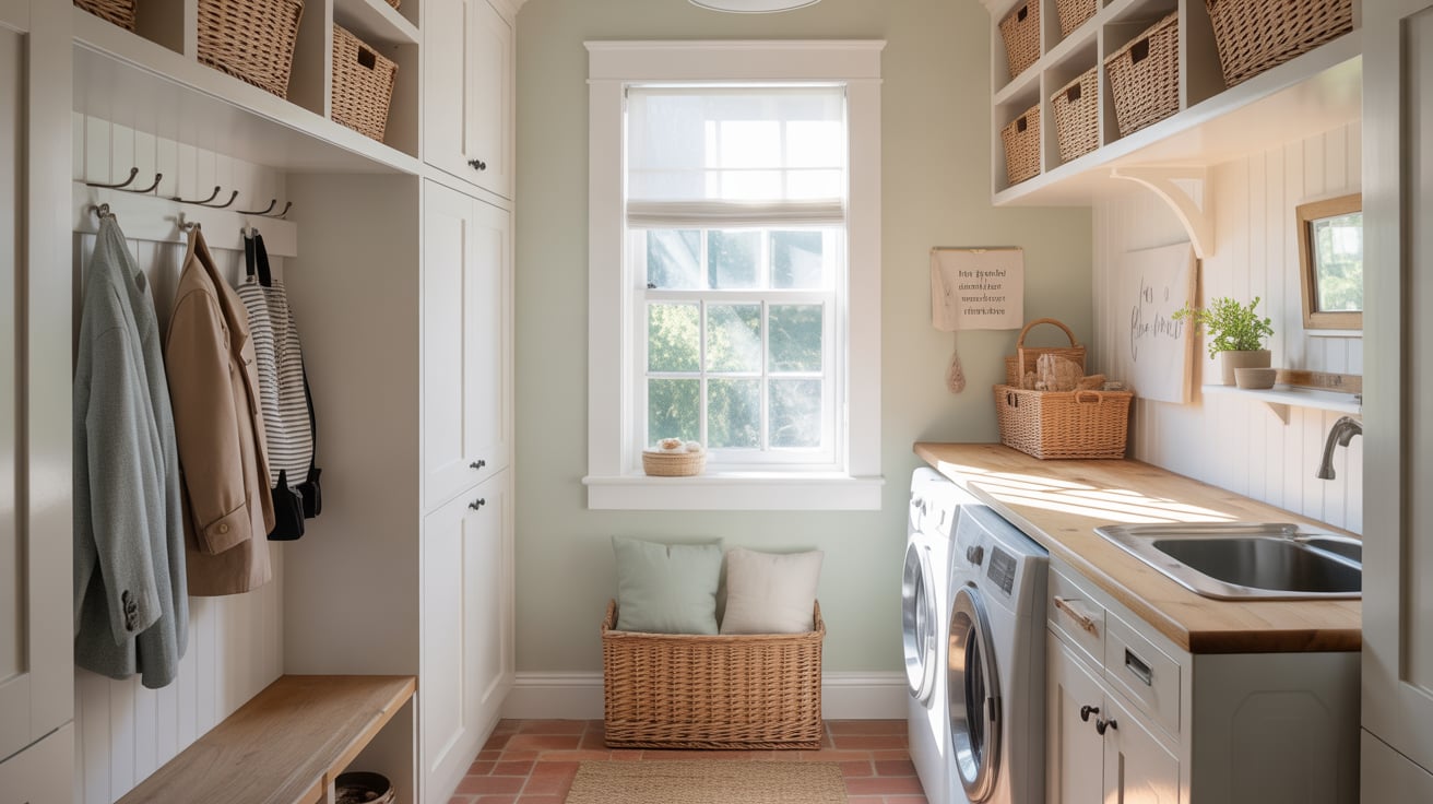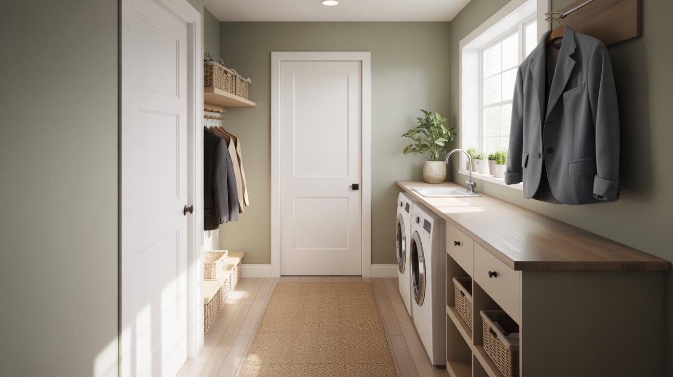 Light colors work because they reflect natural and artificial light, making narrow spaces feel airy and open. They also create a fresh, clean vibe for laundry and mudroom tasks.