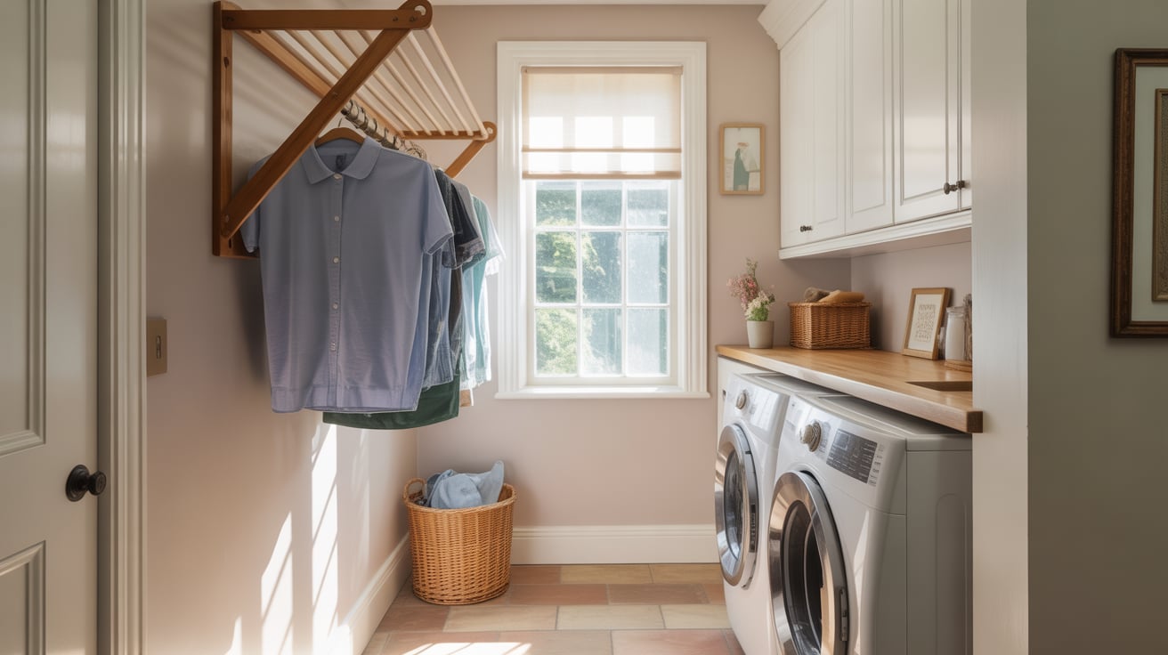 Fold-down racks are ideal for small combo rooms. They provide drying space without sacrificing floor space and keep the room functional.