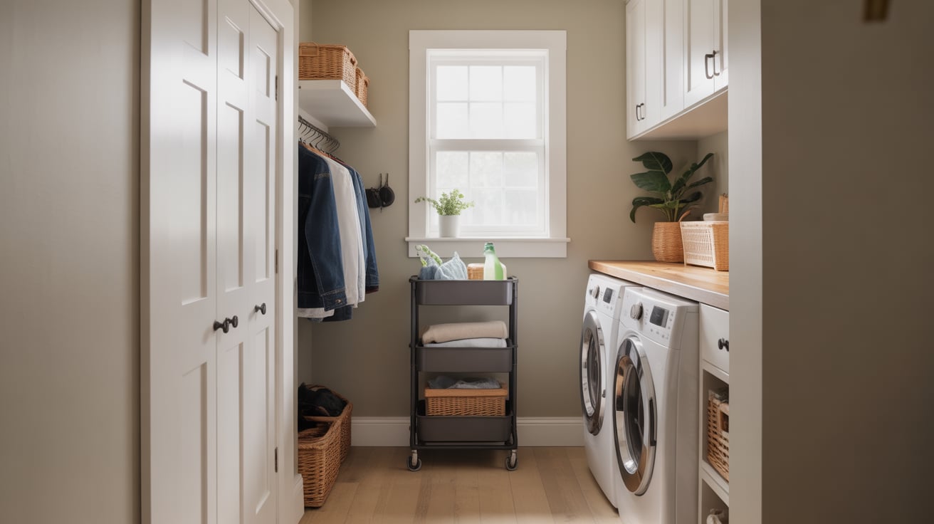 Rolling carts are flexible, mobile, and perfect for combo rooms. They can hold supplies, laundry, or even serve as a folding station.