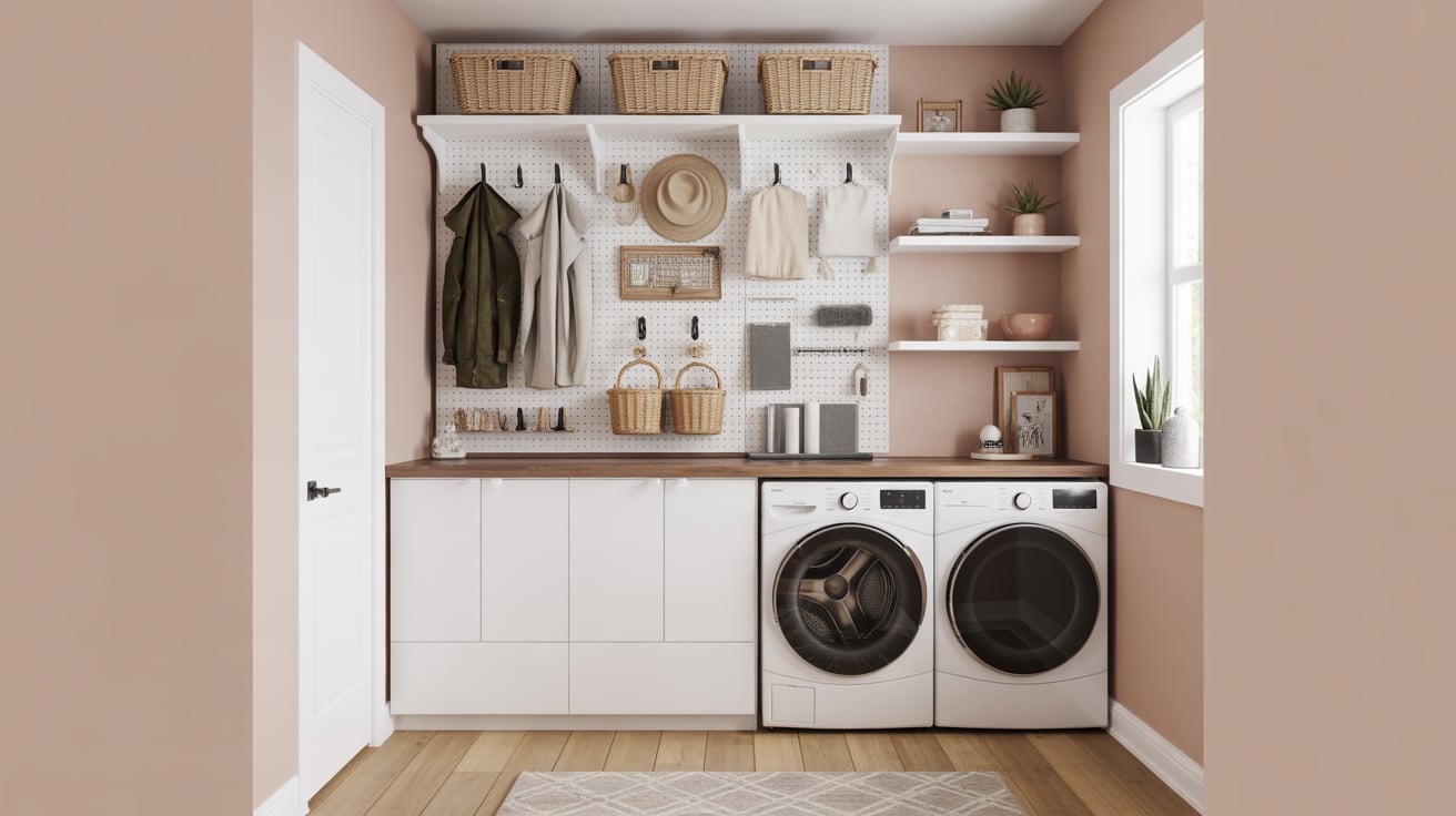 Small items like lint rollers and keys always went missing. A pegboard wall keeps everything organized and visible.