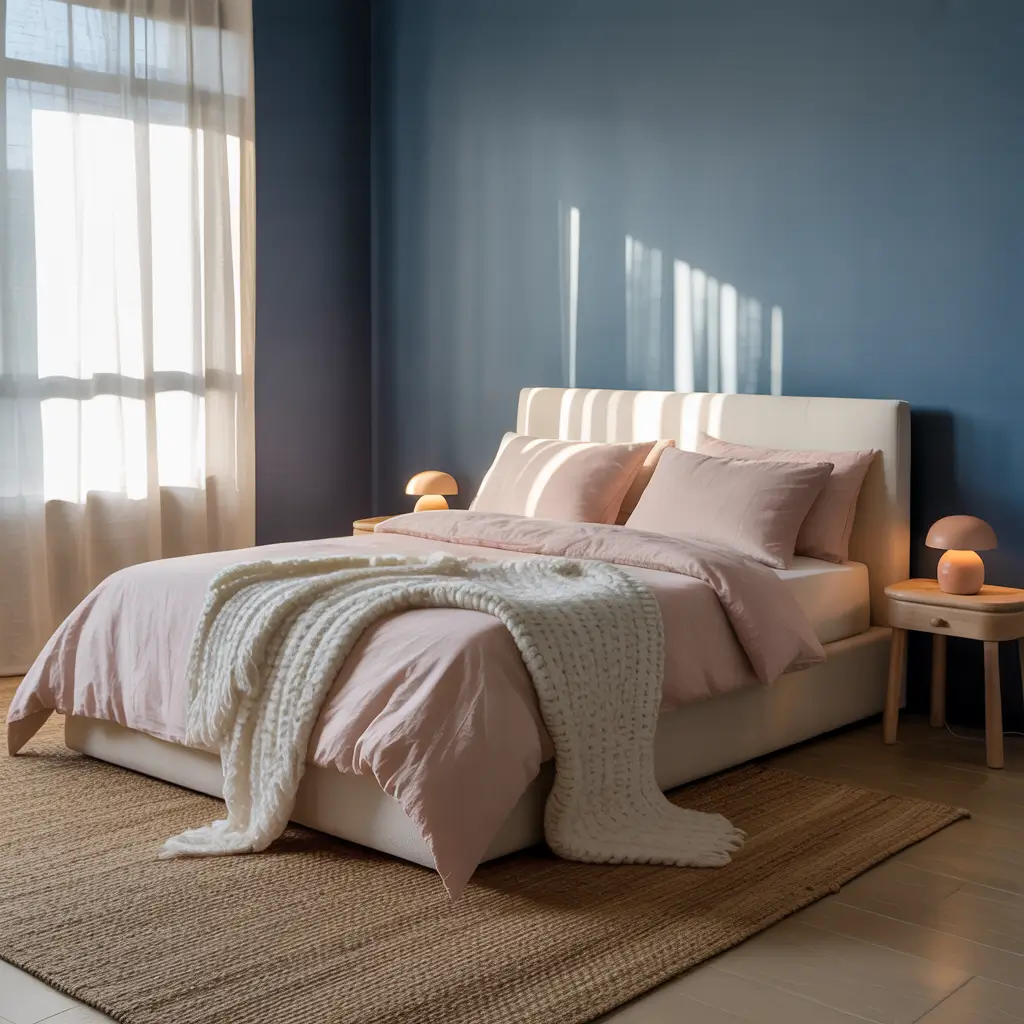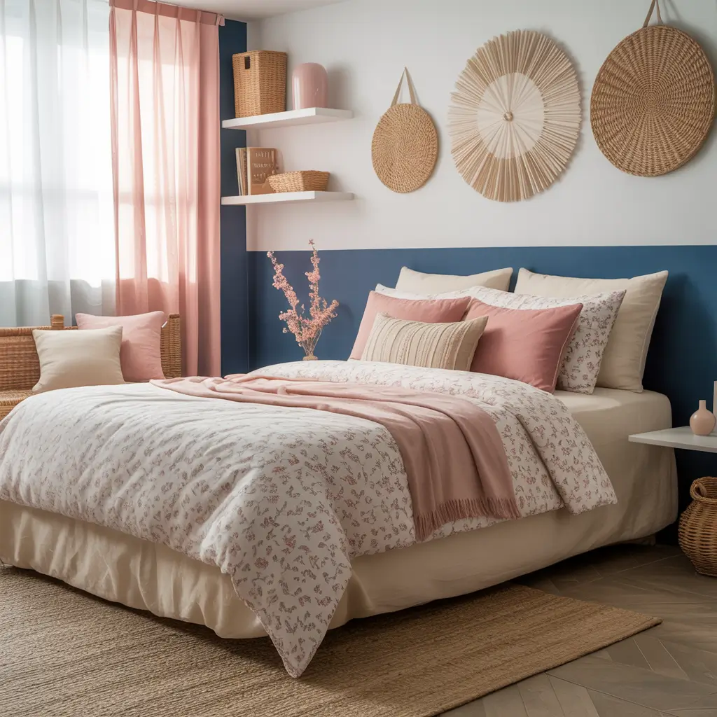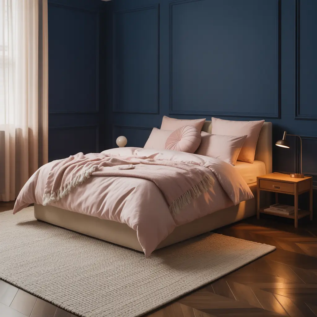 Paint the walls a crisp white or very pale pink. Use navy sparingly—maybe just the bedding and one piece of furniture like a dresser or nightstand. Add soft pink through one or two carefully chosen items: a floor cushion, a single piece of wall art, or a ceramic vase.