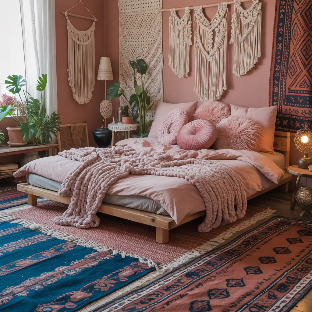 Start with a navy accent wall featuring some kind of texture—maybe wood planks, fabric wall hangings, or even a navy tapestry. Then bring in pink through various boho elements like macramé wall hangings, patterned throw pillows, and vintage-style rugs.