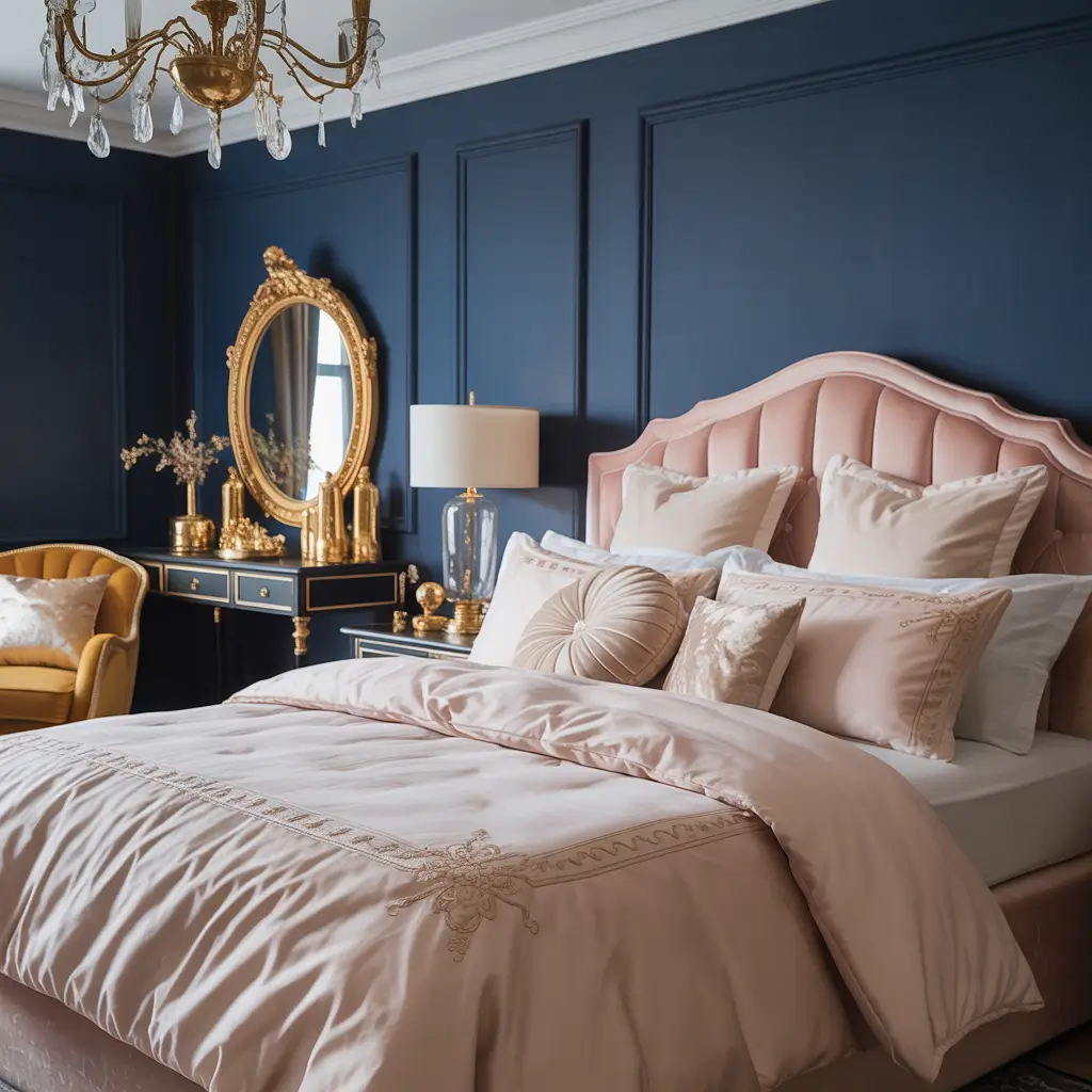 Gold accents are your secret weapon here. They bridge navy and pink while adding that touch of opulence. Think gold-framed mirrors, gold drawer pulls, gold light fixtures, and gold decorative objects.