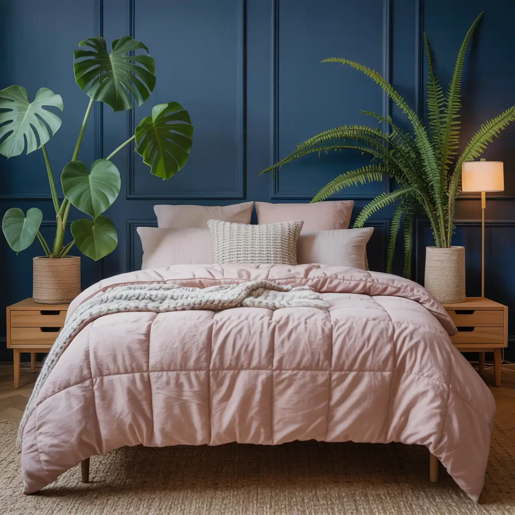 Navy walls create instant drama. They make a room feel cozy, sophisticated, and honestly, way more expensive than it probably is. But dark walls need the right contrast, and that’s where pink bedding comes in clutch.