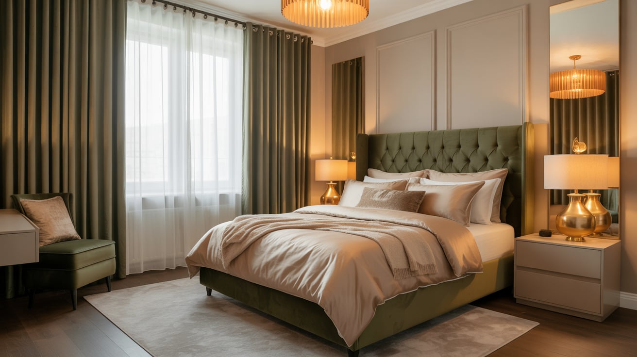 Olive curtains anchor your room, creating depth and movement. When paired with neutral walls and warm lighting, the result feels luxurious yet understated.