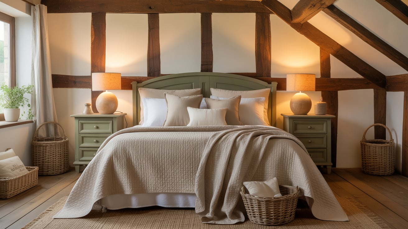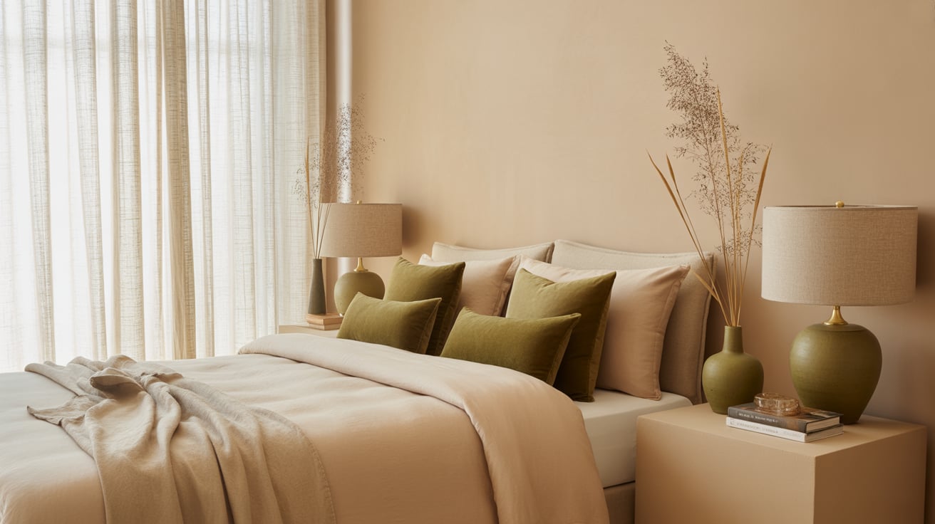- Layer beige bedding with olive cushions or throws.