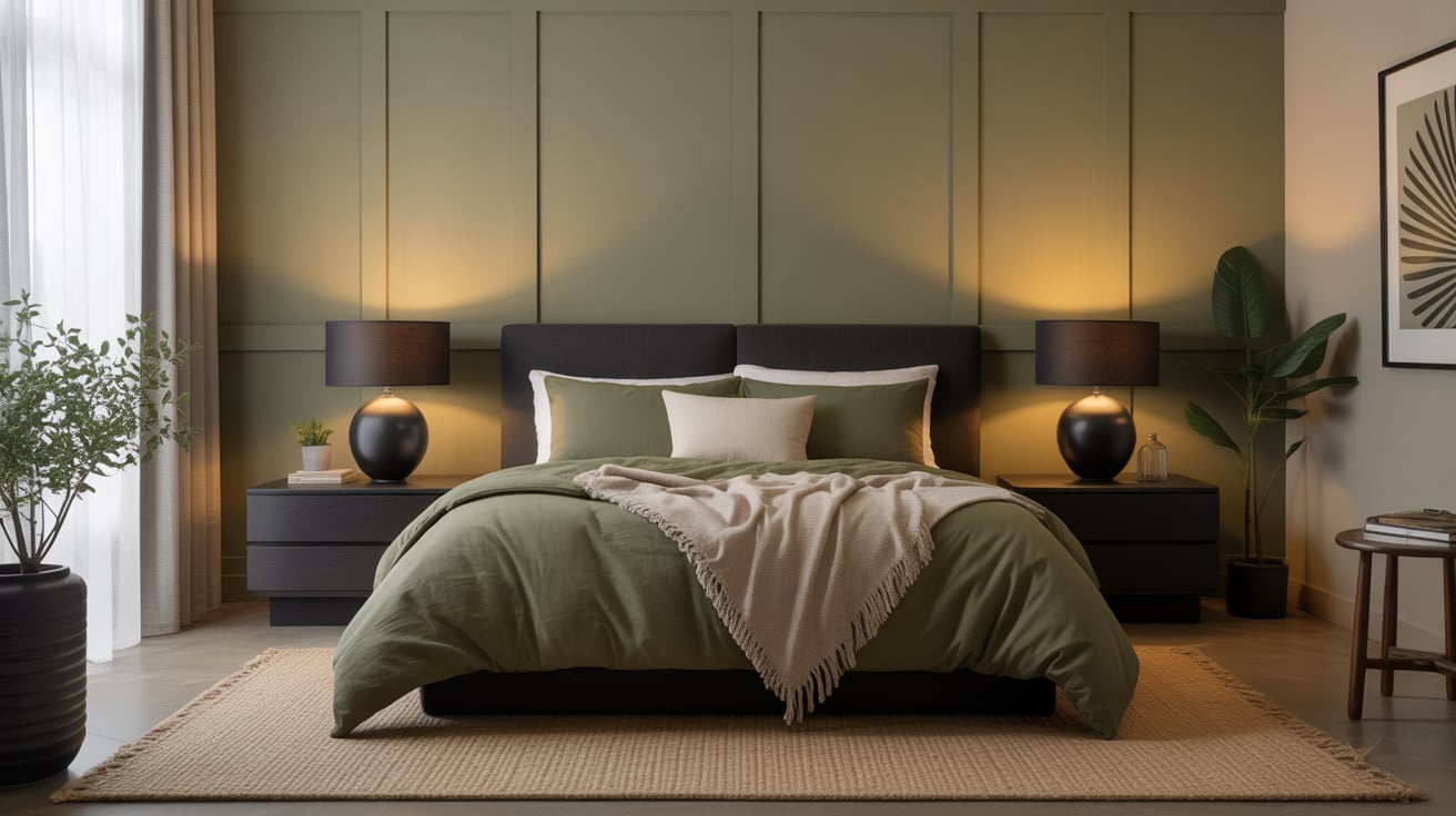 For a modern and bold look, combine olive green with black accents like lamps, frames, or bed frames. The dark contrast adds drama and sophistication.