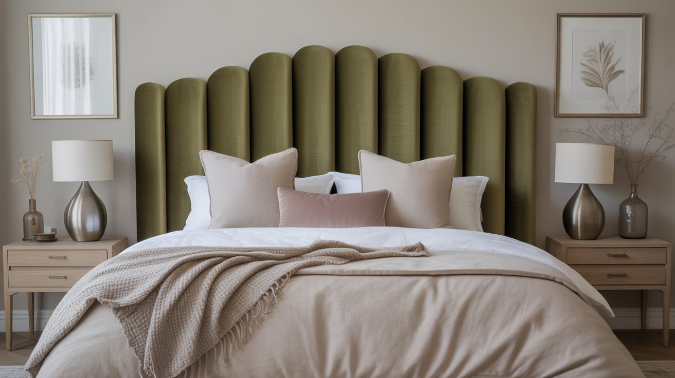 A statement headboard in olive green can be the centerpiece of your bedroom. Choose upholstered or wooden options depending on your style.