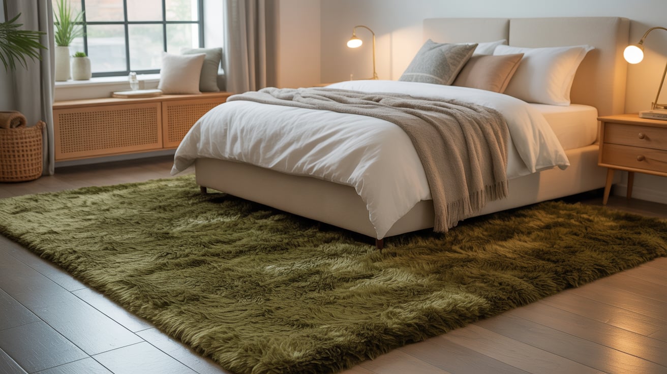 A large olive green rug can tie the room together, adding warmth and texture to hardwood or tile floors. Choose soft, plush materials to make your bedroom feel cozy and inviting.