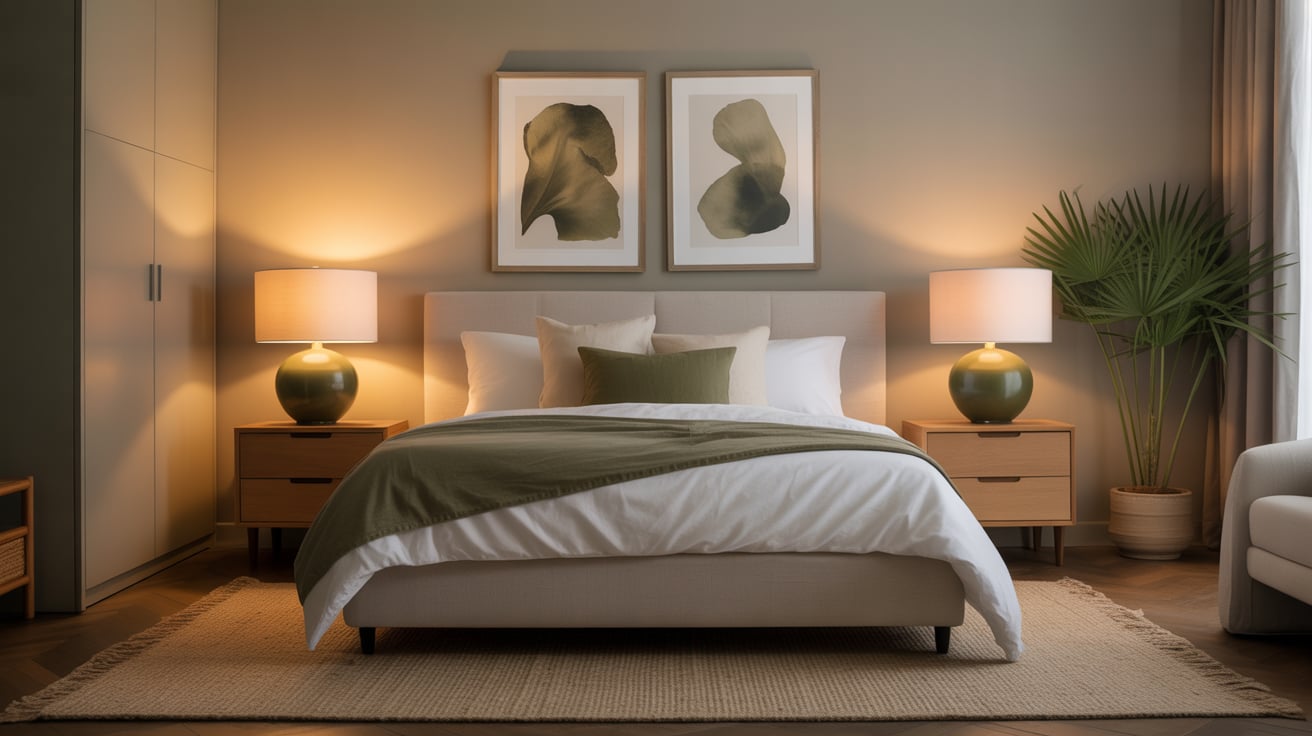 Decorate your bedroom with olive-toned wall art or framed prints. This is a subtle way to introduce color without painting or buying large furniture pieces.