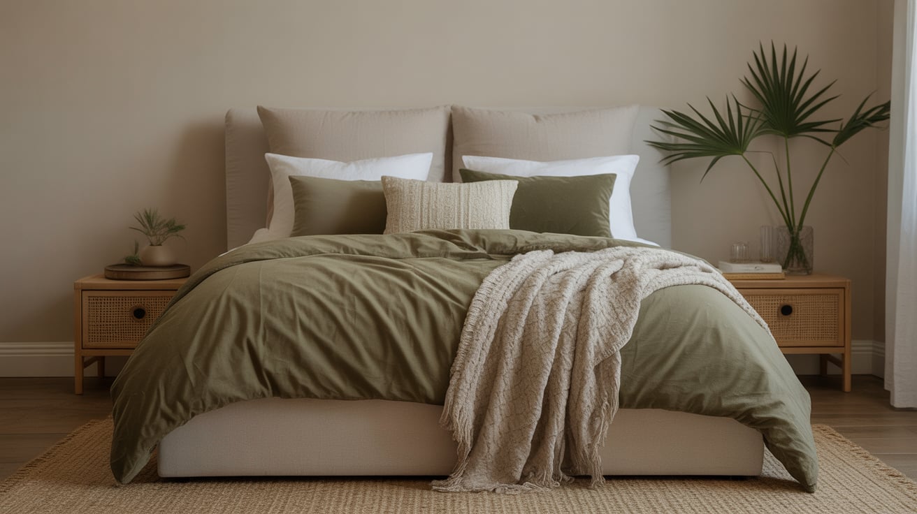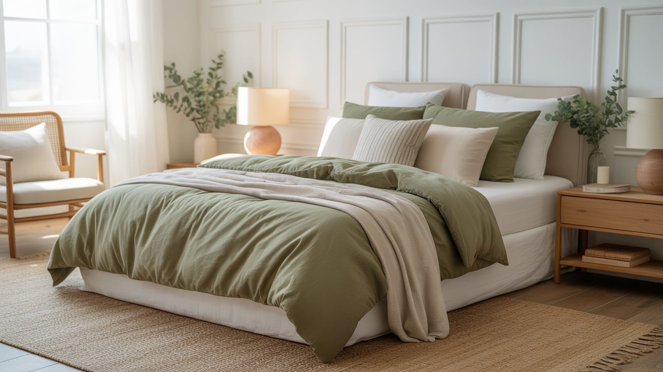 Layer olive green pillows and throws on neutral bedding to add warmth and texture. This allows flexibility if you want to change colors seasonally.
