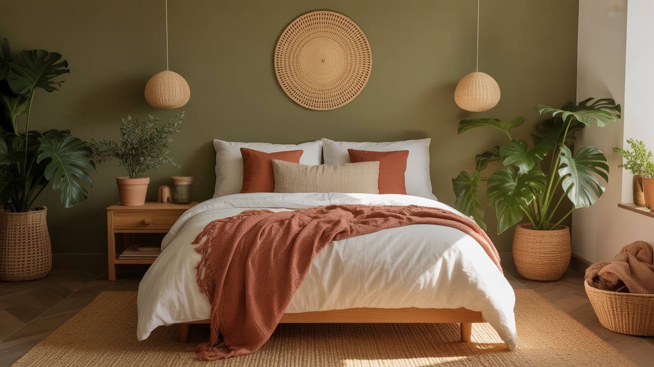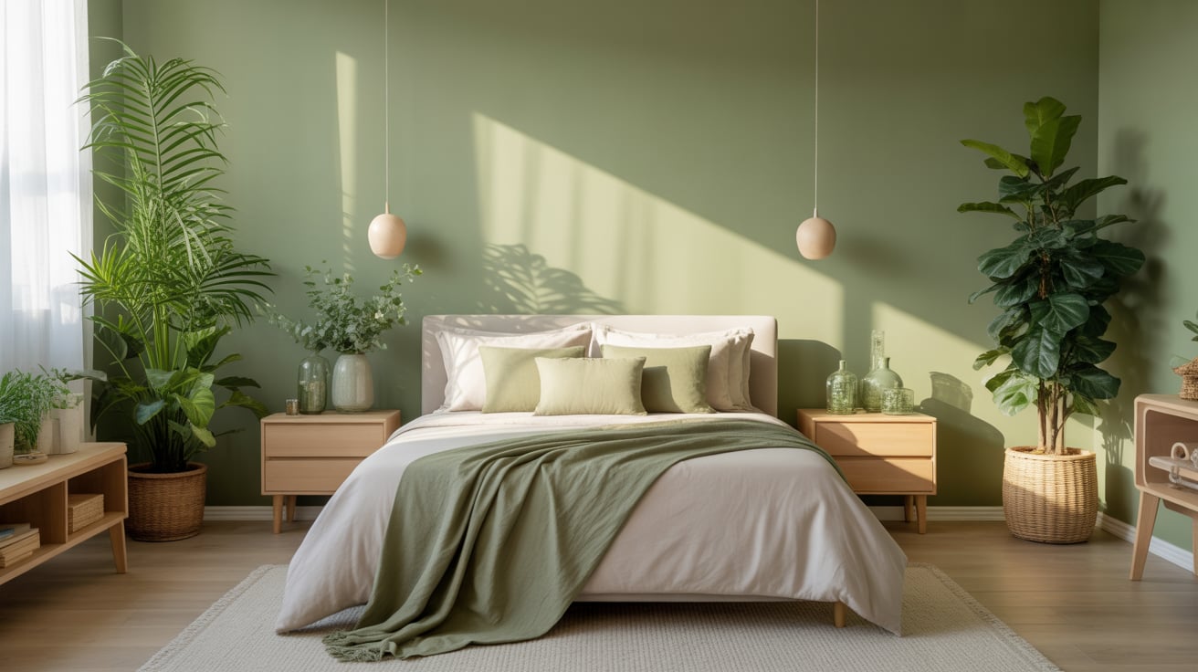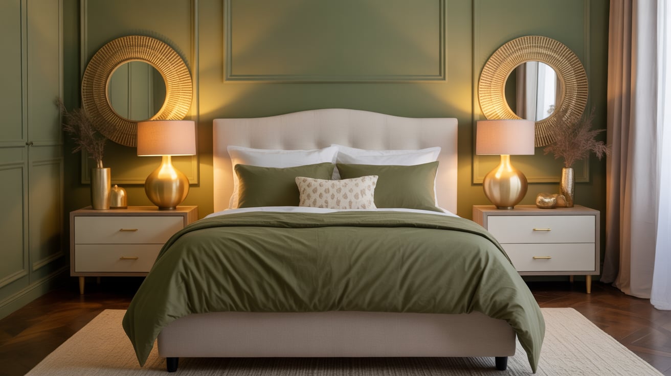 Olive green works perfectly with earthy tones like terracotta, beige, and natural wood. Use wooden nightstands, woven baskets, or terracotta vases to bring texture and life to your room.