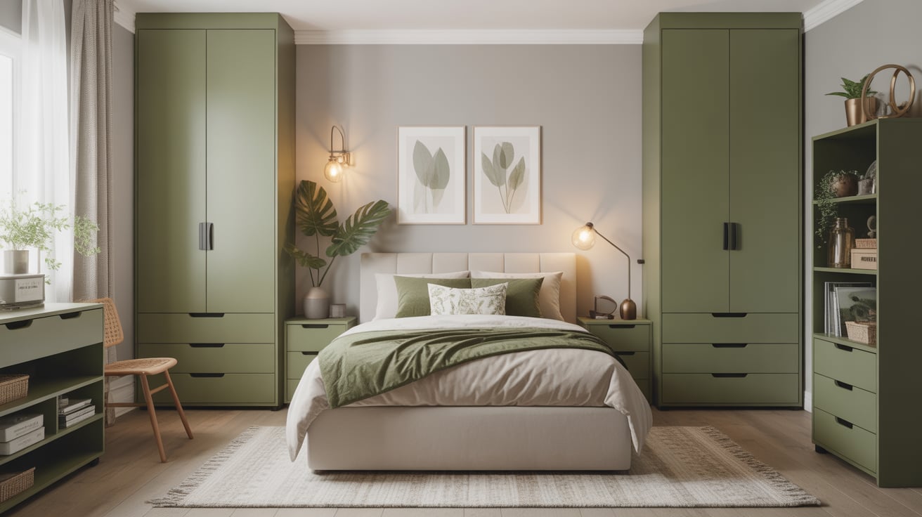 Incorporate olive green storage pieces like wardrobes, shelves, or drawers. It’s functional while keeping the color theme consistent.