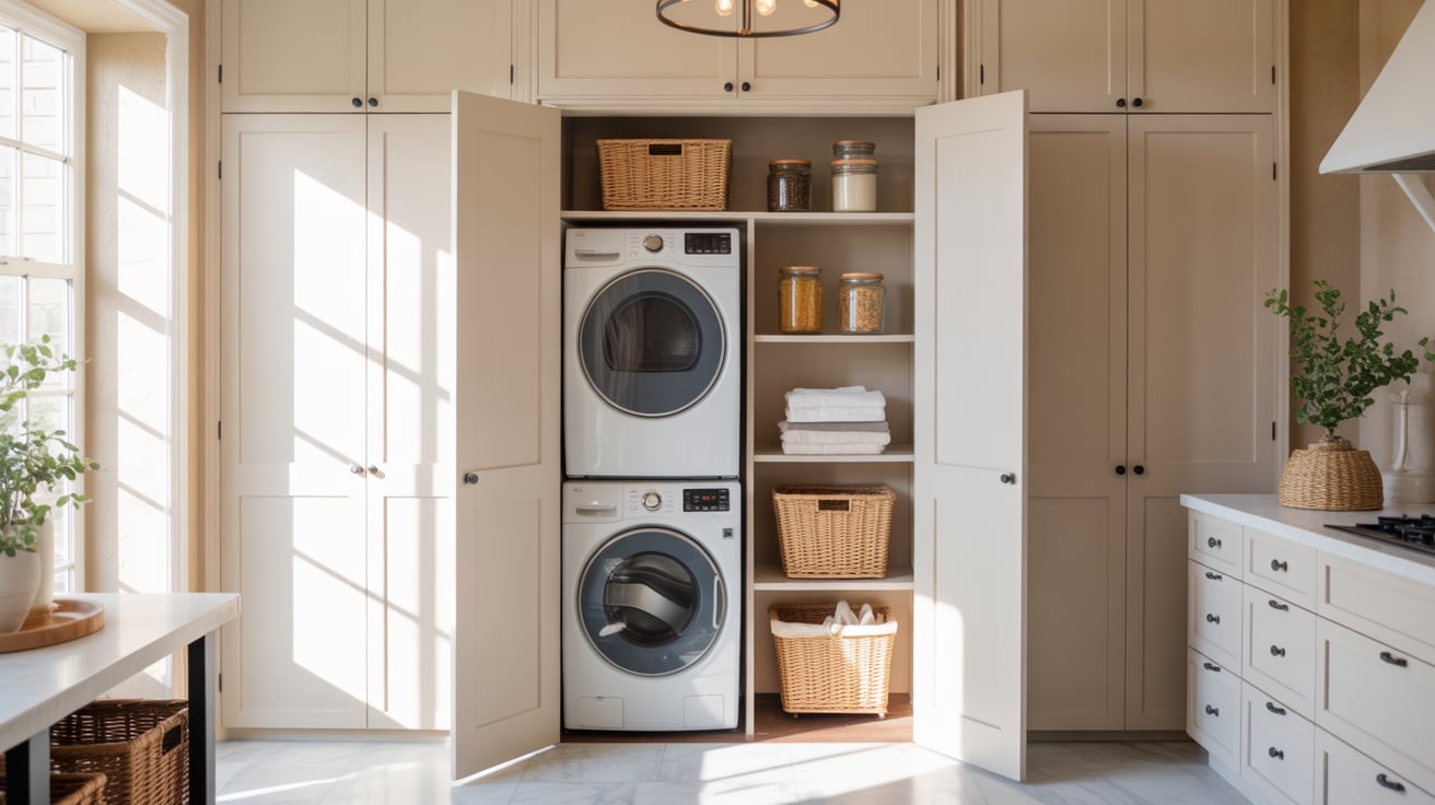 This combo works because it keeps your laundry tucked away while giving the illusion of a full pantry wall. Sliding or bi-fold doors make the space multifunctional yet elegant.