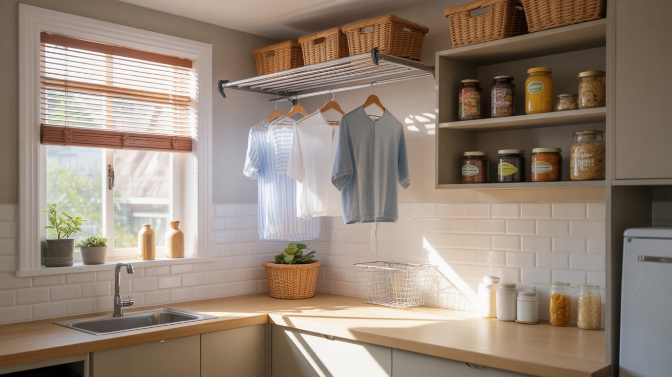 Integrating a pull-out or foldable drying rack over pantry shelving adds practical elegance. It’s space-smart and keeps laundry day smooth.
