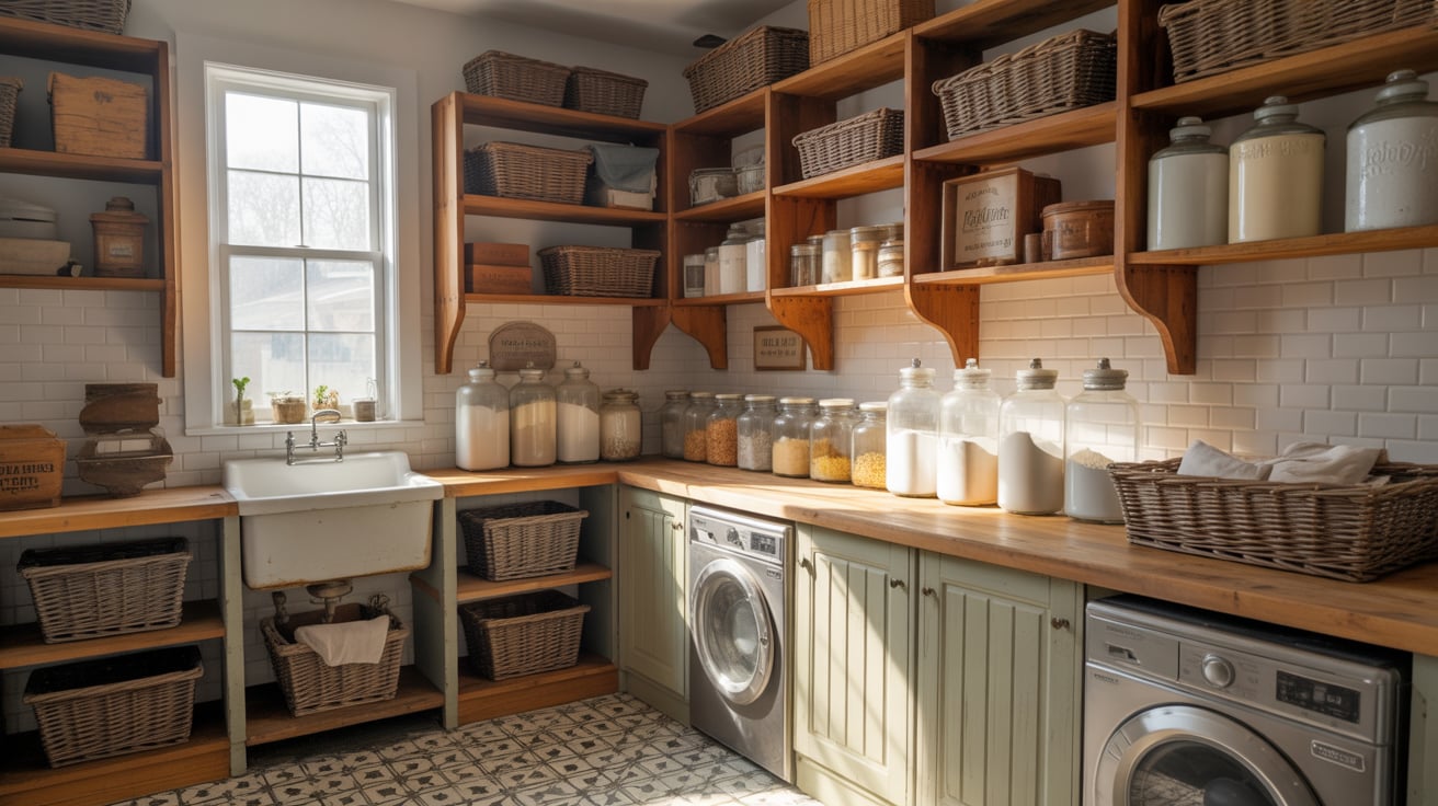 Use reclaimed wood shelves, vintage jars, and wire baskets to blend pantry and laundry storage seamlessly. It’s cozy, functional, and never goes out of style.