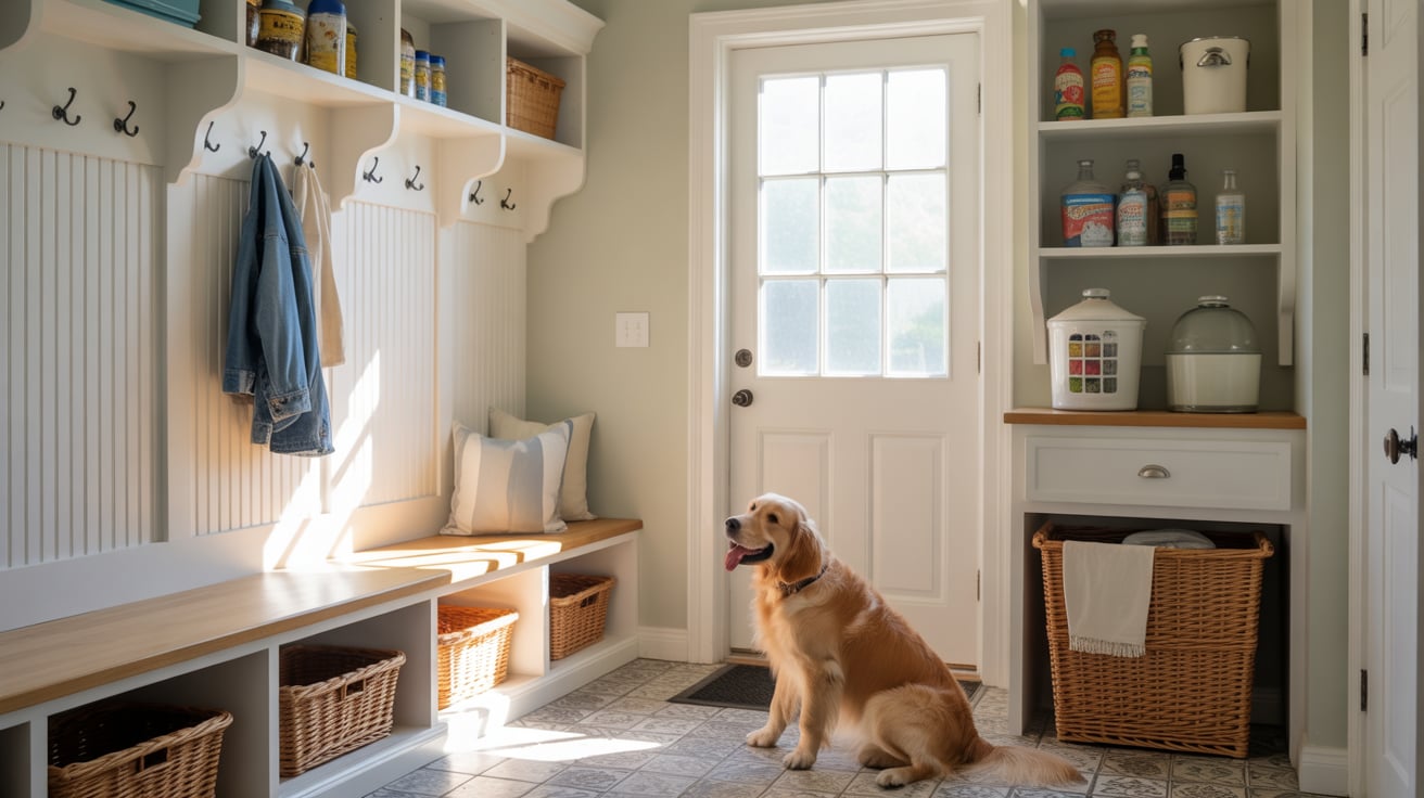 Combining all household functions into one smart zone keeps everything efficient — storage for boots, coats, cleaning, and groceries all in one place.