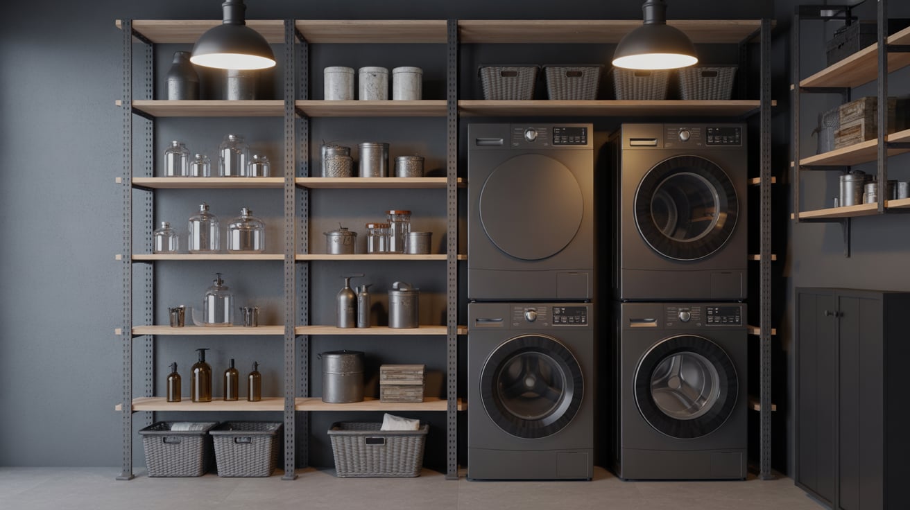 Industrial style works great for shared pantry-laundry spaces because it’s tough, easy to clean, and visually striking.