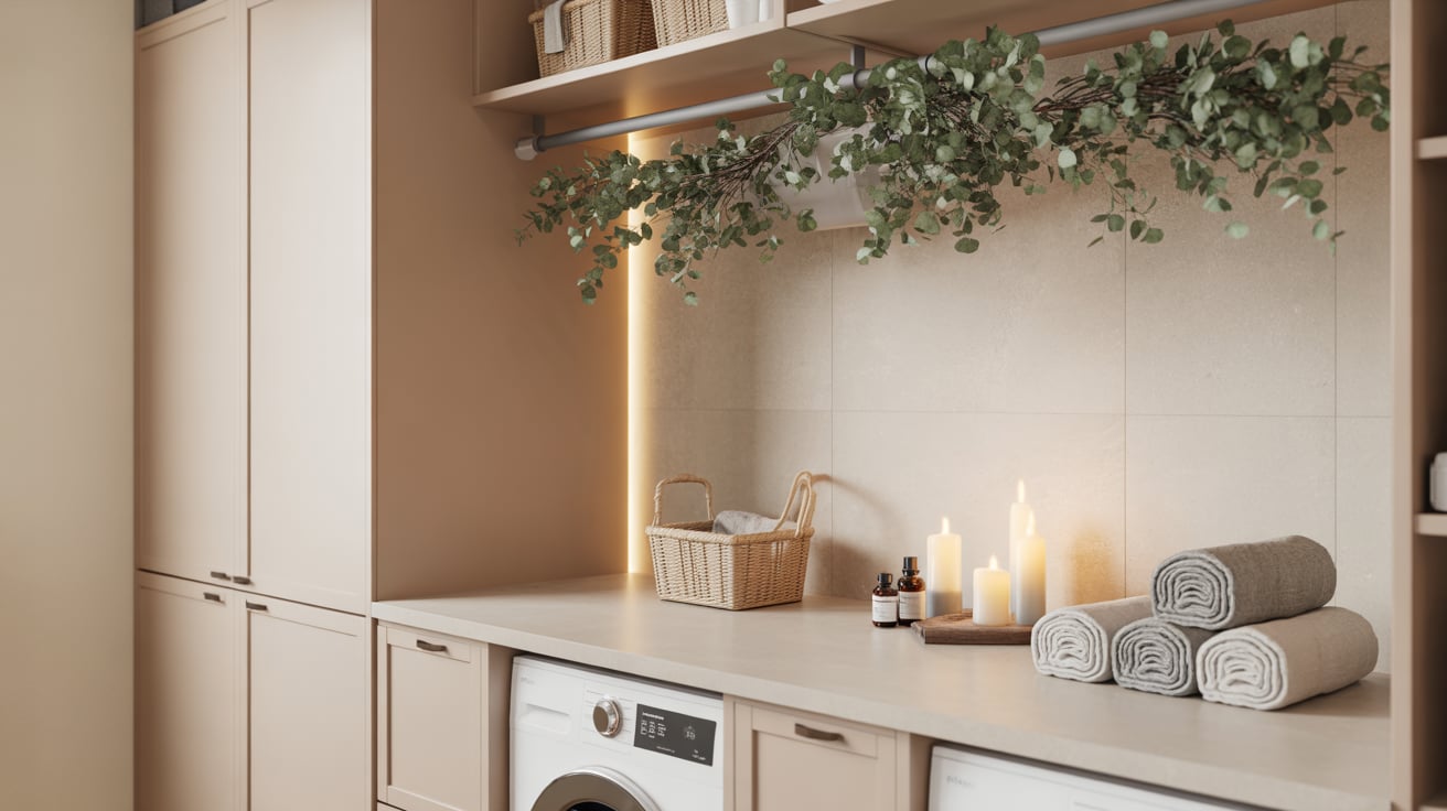 After a long week, I wanted even my chores to feel relaxing. So I added candles, soft lighting, and eucalyptus touches to my pantry-laundry combo — instant spa vibes!