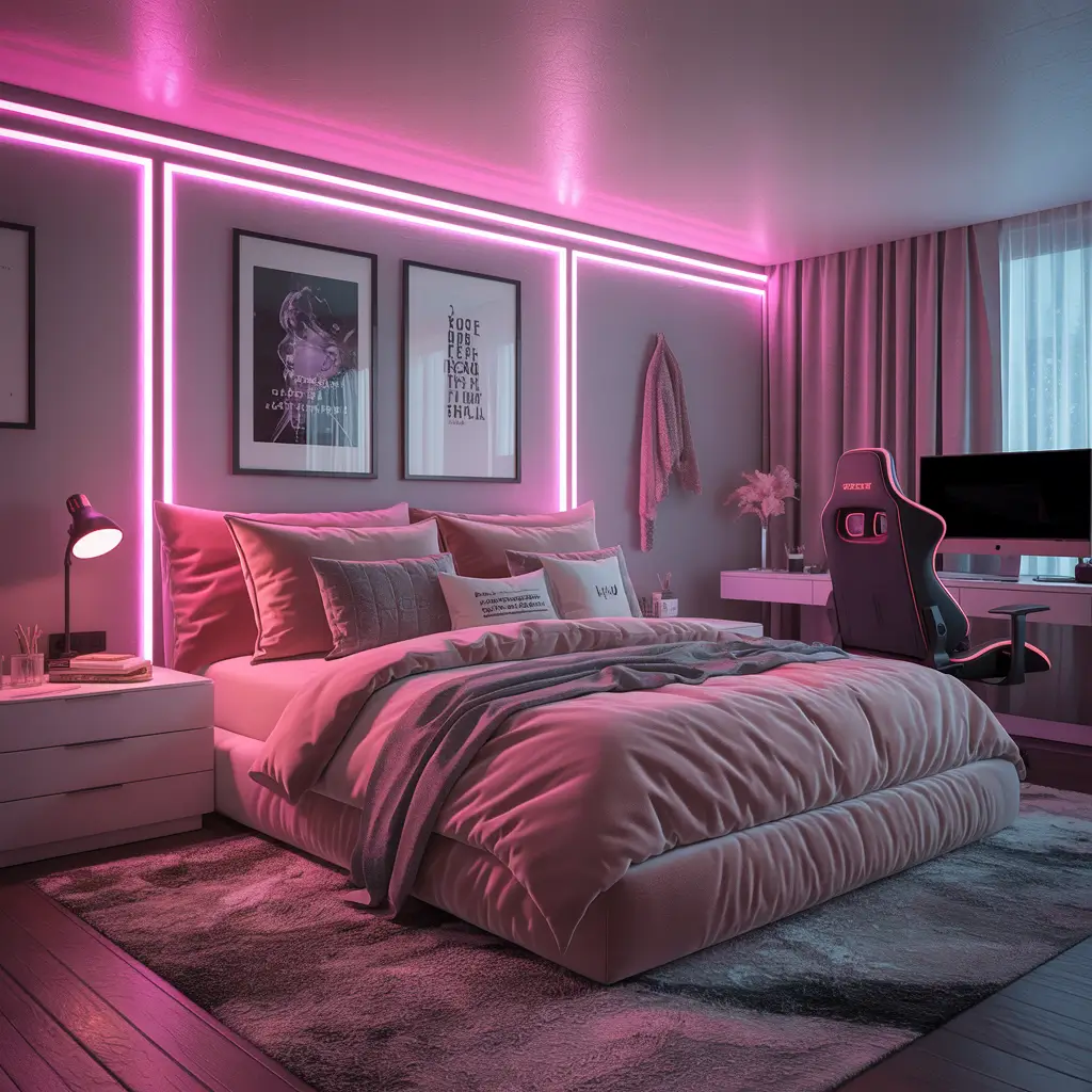 The pink neon LED aesthetic brings serious Gen Z energy. This look combines pink elements with neon lighting to create a space that’s part bedroom, part vibe zone. It’s modern, it’s edgy, and it photographs incredibly well in low light.