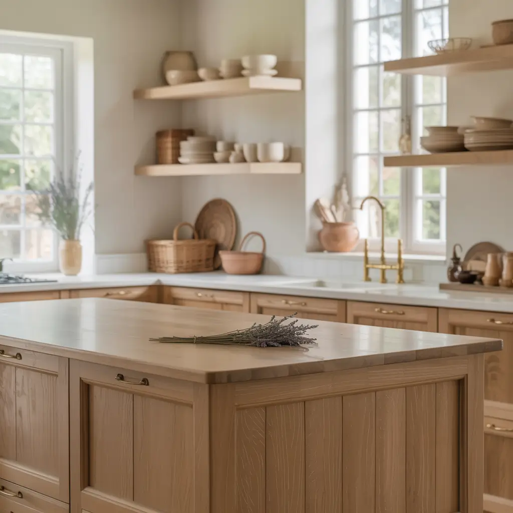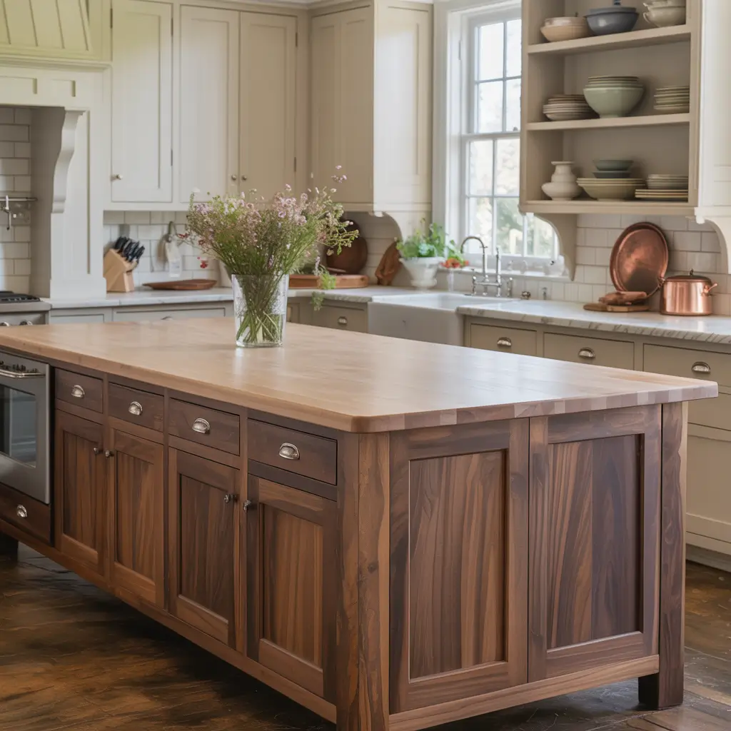I love this approach for smaller kitchens or modern farmhouse styles. You get that rustic warmth without the space feeling crowded or overly busy. A simple wooden island with straight lines and natural finish can anchor your kitchen without demanding all the attention.