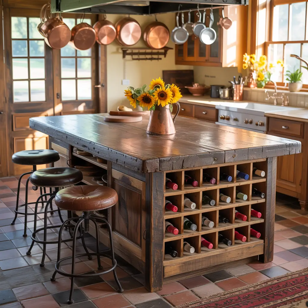 The rustic farmhouse aesthetic works perfectly with wine storage because you can make it a design feature. Use chunky wood to create the X-patterns, or go with wrought iron wine holders mounted to reclaimed wood. Either way, you’re adding architectural interest to your island while solving a real storage problem.