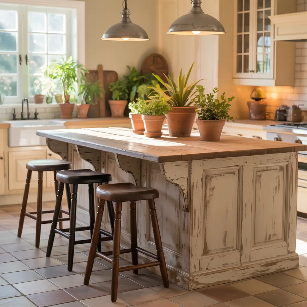 I particularly love islands where the distressed finish reveals multiple paint layers—maybe a chippy white finish showing glimpses of sage green or barn red underneath. This creates depth and visual interest that plain painted finishes just can’t match. You can buy pre-distressed pieces or DIY this look with some paint, sandpaper, and patience.