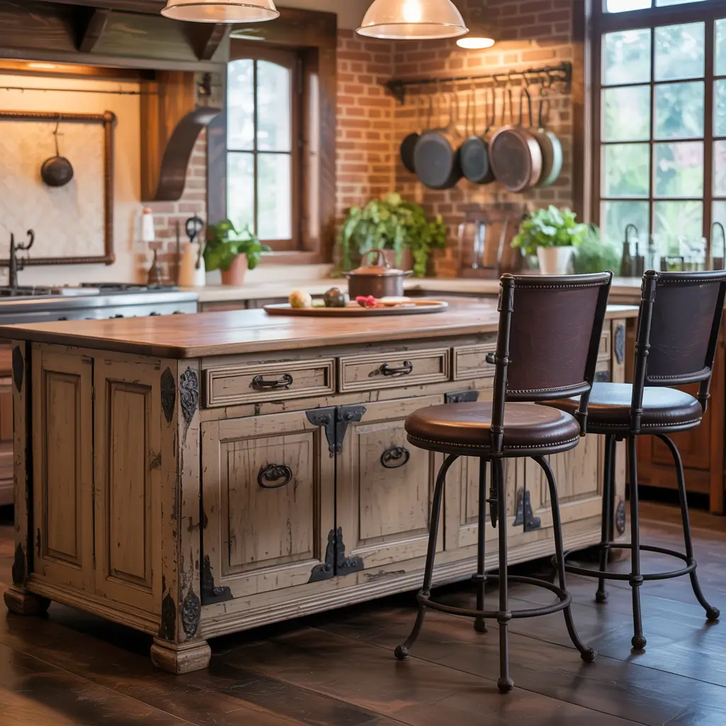 Choose seating that complements your rustic vibe—think wooden stools with metal frames, upholstered seats in natural linen, or even vintage tractor seats if you’re feeling extra farmhouse-y. The seating you pick can either blend in with your island or create a complementary contrast.