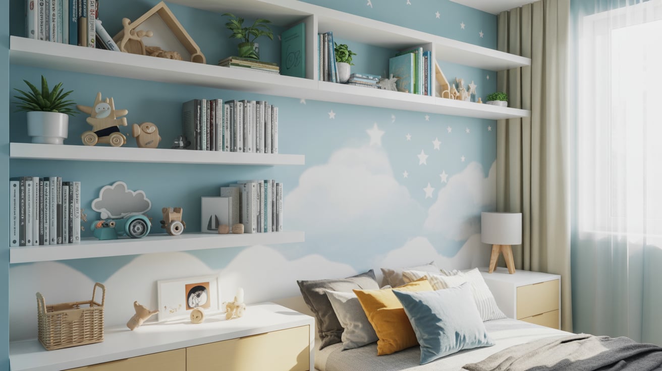 Floating shelves save floor space while creating a fun display wall. They’re great for showcasing books, models, or photos, adding personality without bulk.