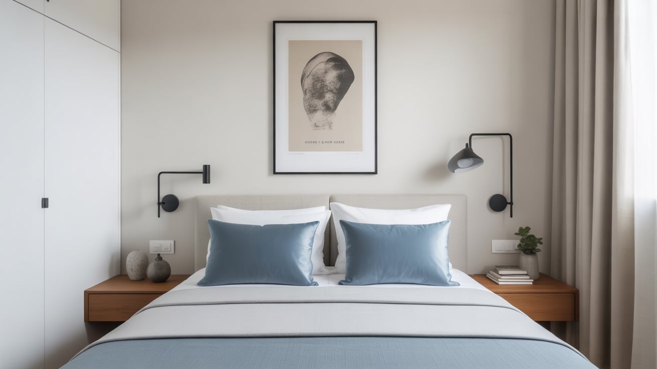 Lighting transforms mood and functionality. Layered lights — ceiling, desk, and night lamps — make small rooms feel cozy and dynamic.