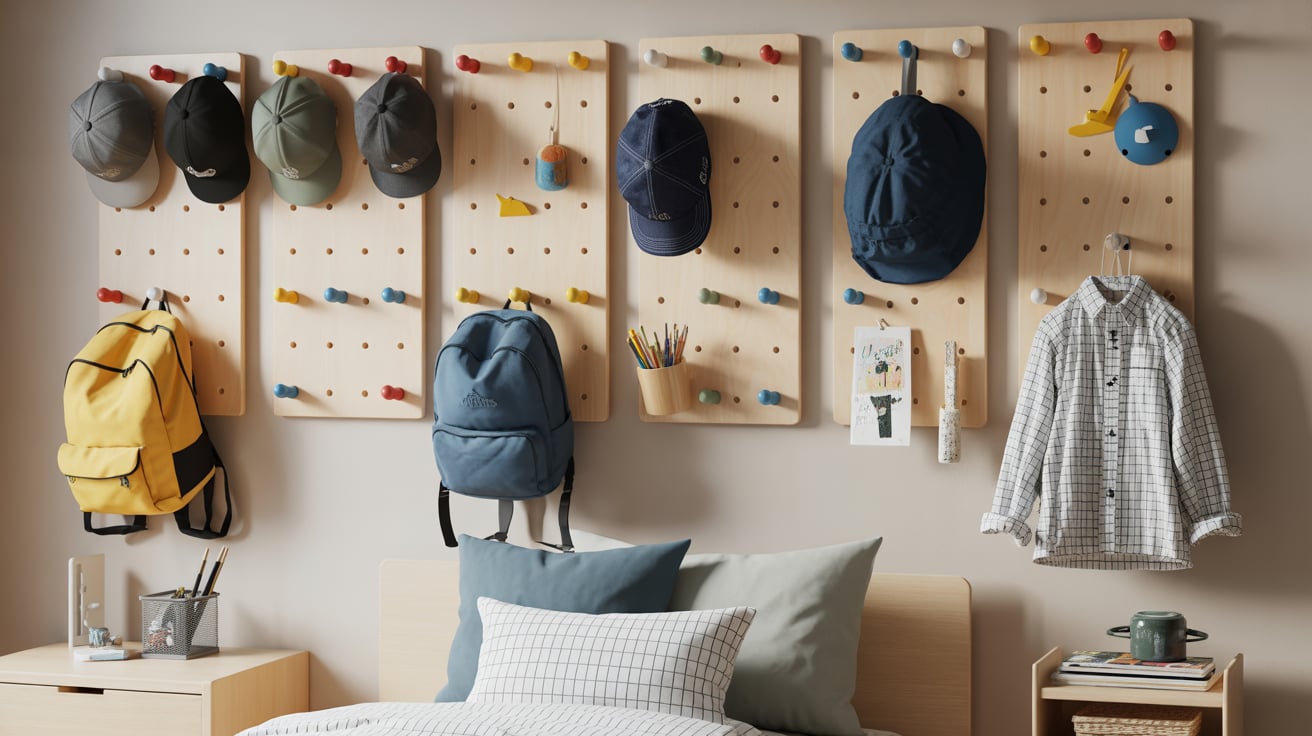 Pegboards are perfect for small boys’ bedrooms because they’re flexible, fun, and super space-saving. You can rearrange hooks and baskets anytime.