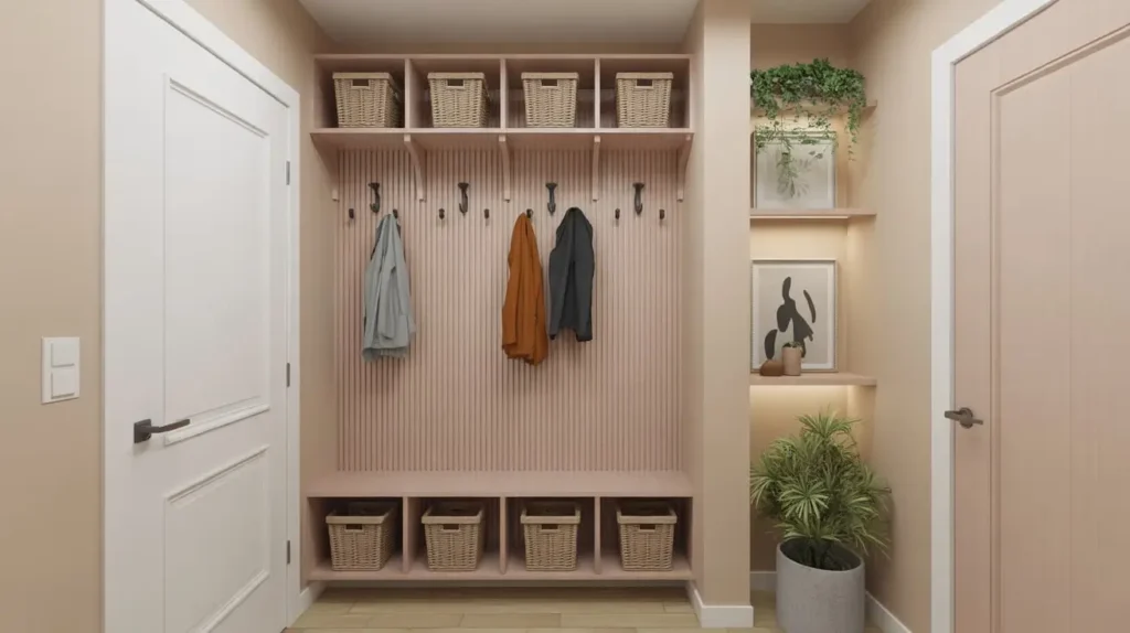 I experimented with this approach in my current space, and the difference in how it feels is wild. A simple white shelf, three wooden pegs for coats, and a single plant create this calm, uncluttered vibe that actually makes me feel less stressed when I walk in the door.
